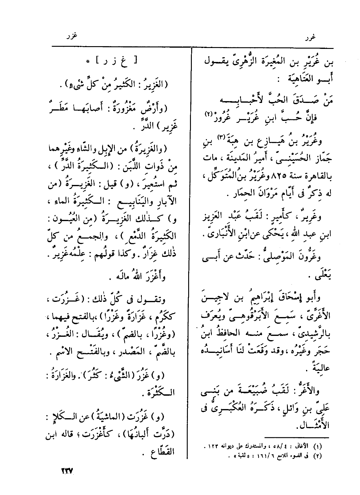 . الغَزِيرُ: الكَثيرُ مِن كلِّ شئٍ. وأَرْضٍ مَغْزُورَةٌ: أَصابَها مَطَرٌ غَزِير الدَّرِّ. والغَزِيرَةُ من الإِبِل والشّاءِ وغَيْرِهما مِنْ ذَواتِ اللَّبَن: الكَثِيرَةُ الدَّرِّ، ثمَّ استُعِيرَ، وَقيل: الغَزِيرَةُ من الآبارِ واليَنَابِيع: الكَثِيرَةُ الماءِ، وَكَذَلِكَ الغَزِيرَةُ مِن العُيُون: الكَثِيرَةُ الدَّمْعِ، والجمعُ من كُلّ ذَلِك غِزَارٌ. وَكَذَا قولُهم: عِلْمُه غَزِيرٌ. وأَغْزَرَ اللهُ مالَه. وَتقول فِي كُلّ ذَلِك: غَزُرَت، ككَرُم، غَزَارَةً وغَزْراً، بِالْفَتْح فيهمَا، وغُزْراً، بالضمّ، ويُقَال: الغُزْرُ، بالضَّمّ، المَصْدر، وبالفَتْح الاسْم. وغَزُرَ الشَّيْءُ: كَثُرَ. والغَزَارَةُ: الكَثْرَة. وغَزُرَت الماشيَةُ عَن الكَلإِ: دَرَّت أَلبانُهَا، كأَغْزَرَت قَالَه ابْن القَطّاع.