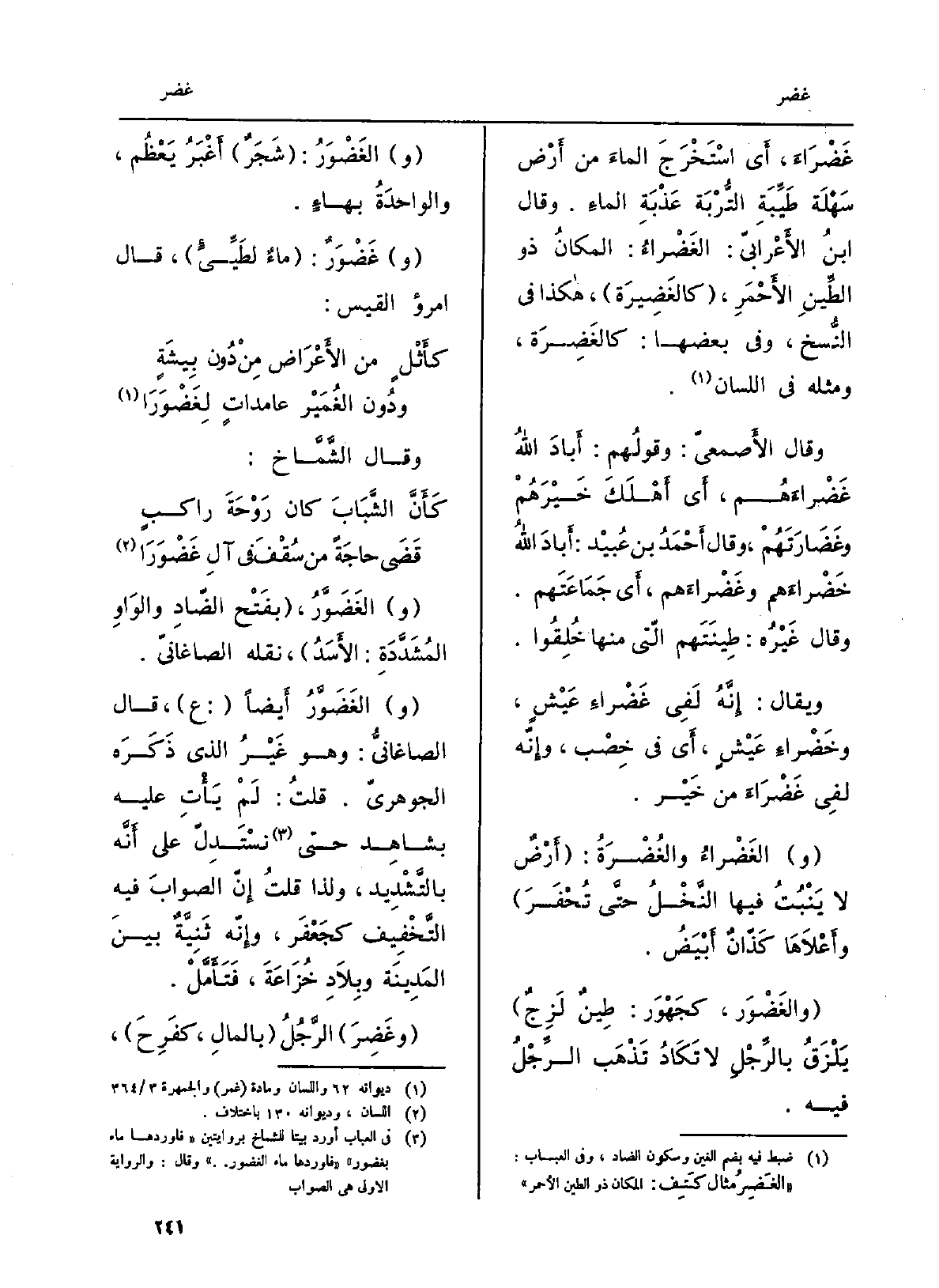 وَقَالَ غَيْرُه: طِيْنَتَهم الّتي مِنْهَا خُلِقُوا. وَيُقَال: إِنّهُ لَفِي غَضْراءِ عَيْشٍ، وخَضْراءِ عَيْشٍ، أَي فِي خِصْب، وإِنّه لفِي غَضْرَاءَ من خَيْر. والغَضْراءُ والغُضْرَةُ: أَرْضٌ لَا يَنْبُتُ فِيهَا النَّخْلُ حتَّى تُحْفَرَ وأَعْلاَهَا كَذّانٌ أَبْيَضُ. والغَضْوَر، كجَهْوَر: طِينٌ لَزِجٌ يَلْزَقُ بالرَّجْلِ لَا تَكَادُ تَذْهَب الرَّجْلُ فِيهِ. والغَضْوَرُ: شَجَرٌ أَغْبَرُ يَعْظُم، والواحدَةُ بهاءٍ. وغَضْوَرٌ: ماءٌ لَطيِّئّ، قَالَ امْرُؤ الْقَيْس: