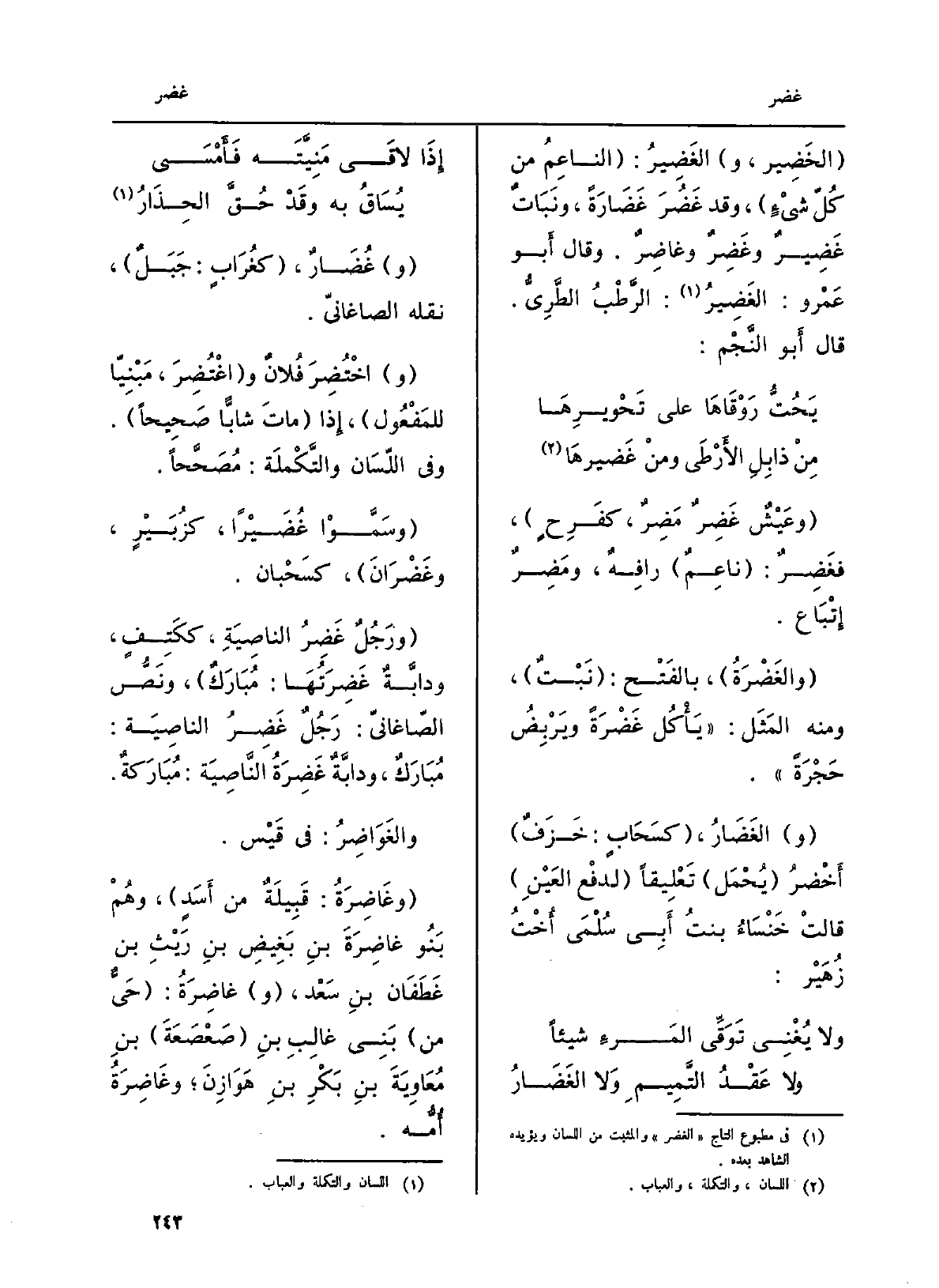 ورَجُلٌ غَضِرُ الناصِيَةِ، ككَتِفٍ، ودابَّةٌ غَضِرَتُهَا: مُبَارَكٌ، ونَصُّ الصّاغانيّ: رَجُلٌ غَضِرُ الناصِيَة: مُبَارَكٌ، ودابَّةٌ غَضِرَةُ النَّاصِيَة: مُبَارَكةٌ. والغَوَاضِرُ: فِي قَيْس. وغَاضِرَةُ: قَبِيلَةٌ من أَسَدٍ، وهُمْ بَنُو غاضِرَةَ بنِ بَغِيضِ بنِ رَيْثِ بن غَطَفَان بنِ سَعْد، وغاضِرَةُ، حَيٌّ من بَنِي غالِبِ)