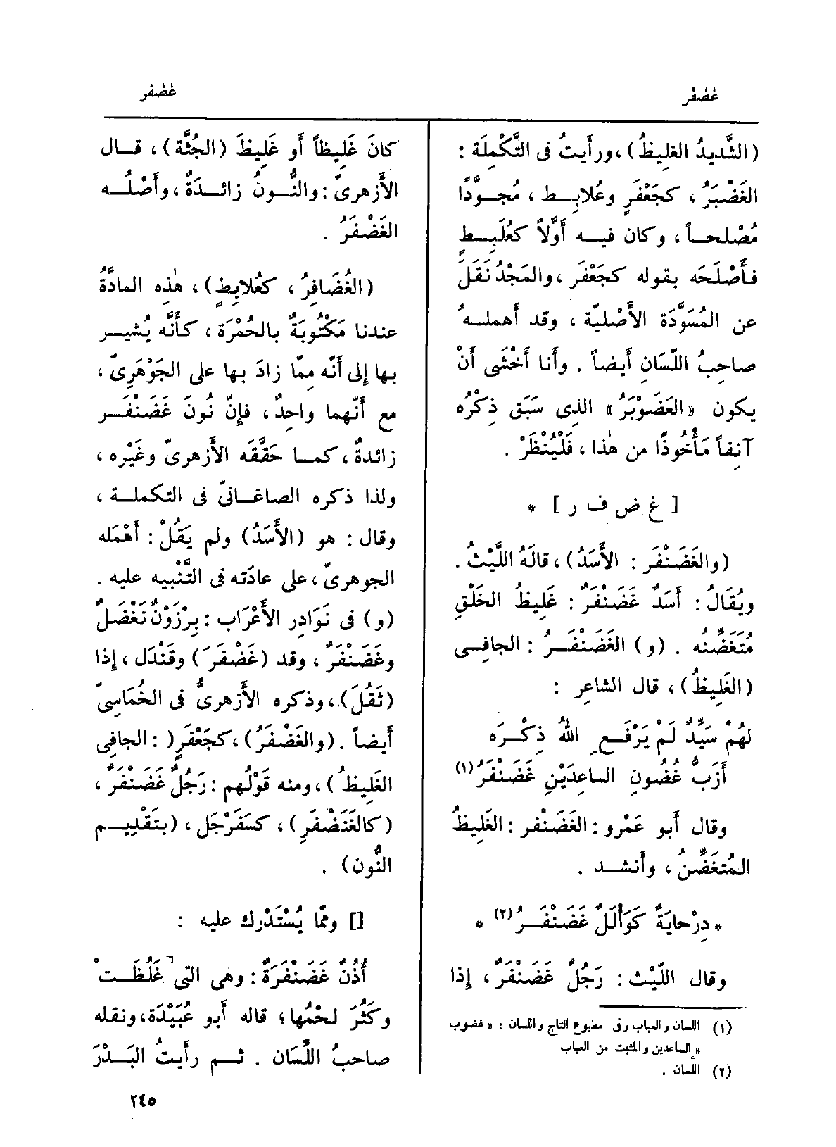 وَقَالَ أَبو عَمْرو: الغَضَنْفر: الغَلِيظُ المُتغَضِّنُ، وأَنشد. دِرْحايَةٌ كَوَأْلَلٌ غَضَنْفَرُ. وَقَالَ اللّيْث: رَجُلٌ غَضَنْفَرٌ، إِذا كانَ غَلِيظاً أَو غَلِيظَ الجُثَّة، قَالَ الأَزْهَرِيّ: والنُّونُ زائدَةٌ، وأَصْلُه الغَضْفَرُ.