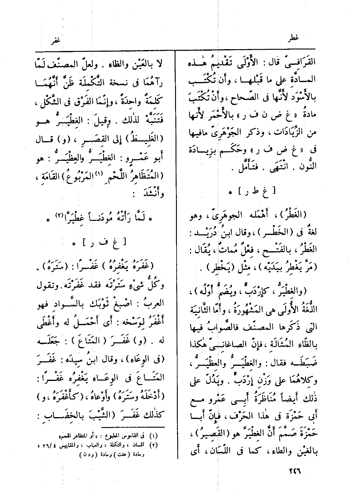القَرَافِيّ قَالَ: الأَوْلَى تَقْديمُ هَذِه المادَّةِ على مَا قَبْلَها، وأَن تُكْتَب بالأَسْوَد لأَنَّها فِي الصّحاح، وأَن تُكْتَبَ مادةُ غ ض ن ف ر بالأَحْمَر لأَنها من الزِّيَّادَات، وَذكر الجَوْهَرِيّ مَا فِيهَا فِي غ ض ف ر وحَكم بزِيادَة النُّون. انْتَهَى. فتَأَمَّل.