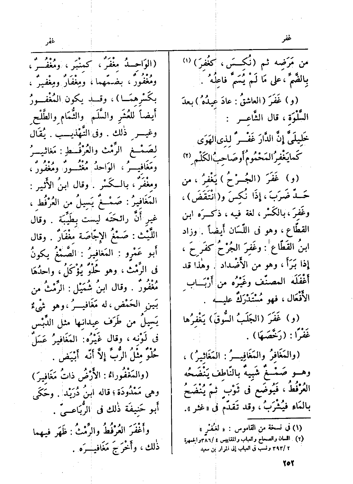 وغَفَرَ الجُرْحُ يَغْفِرُ، من حَدّ ضَرَبَ، إِذا نُكِسَ وانْتَقَضَ، وغَفِرَ، بالكَسْر، لُغَة فِيهِ، ذكرَه ابْن القطّاع، وَهُوَ فِي اللّسَان أَيضاً. وَزَاد ابنُ القَطّاع: وغَفِرَ الجُرْحُ كفَرِحَ، إِذا بَرَأَ، وَهُوَ من الأَضْداد. وَهَذَا قد أَغْفَلَه المصنّف وغَيْرُه من أَرْبَابِ الأَفْعَال، فَهُوَ مُسْتَدْرَكٌ عَلَيْهِ. وغَفَرَ الجَلَبُ السُّوقَ يَغْفِرُها غَفْراً: رَخَّصَهَا. والمَغَافِرُ والمَغَافِيرُ: المَغَاثِيرُ، وَهُوَ صَمْغٌ شَبِيهٌ بالنّاطِف يَنْضَحُه العُرْفُطُ، فَيُوضَع فِي ثَوْبٍ ثمّ يُنْضَحُ بالمَاءِ فيُشْرَبُ، وَقد تَقدّم فِي غثر. الوَاحِدُ مِغْفَرٌ، كمِنْبَر، ومُغْفُرٌ، ومُغْفُورٌ، بضمّهما، ومِغْفَارٌ ومِغْفيرٌ، بكَسْرِهِمَا، وَقد يكون المُغْفورُ أَيضاً للعُشَرِ والسَّلَم والثُّمَامِ والطَّلْحِ وغيرِ ذَلِك. وَفِي التَّهْذيب. يُقَال لِصَمْغ الرَّمْث والعُرْفُطِ: مَغاثيرُ ومَغَافِيرُ، الوَاحدُ مُغْثُورٌ ومُغْفُورٌ، ومِغْفَرٌ، بالكَسْر. وَقَالَ ابنُ الأَثِير: المَغَافِيرُ: صَمْغٌ يَسِيلُ من العُرْفُطِ، غيرِ أَنَّ رائحَتَه لَيست بِطَيِّبَة. وَقَالَ اللَّيْث: صَمْغُ الإِجّاصَة مِغْفَارٌ. وَقَالَ أَبو عَمْروٍ: المَغافِيرُ: الصَّمْغُ يكونُ فِي الرِّمْث، وَهُوَ حُلْوٌ يُؤْكَلُ، واحدُهَا مُغْفُورٌ. وَقَالَ ابنُ شُمَيْل: الرِّمْثُ من بَيْنِ الحَمْض، لَهُ مَغَافيرُ، وَهُوَ شئٌ يَسِيلُ من طَرَف عِيدانِها مثل الدِّبْس فِي لَوْنِه، وَقَالَ) غَيْرُه: المَغَافيرُ عَسَلٌ حُلْوٌ مِثْلُ الرُّبِّ إِلاَّ أَنّه أَبْيَض. والمَغْفُوراءُ: الأَرْضُ ذاتُ مَغَافِيرَ وَهِي مَمْدُودَة قَالَه ابْن دُرَيْد. وحَكَى أَبو حَنِيفَة ذَلِك فِي الرُّبَاعيّ. وأَغْفَرَ العُرْفُطُ والرِّمْثُ: ظَهَر فيهمَا ذَلِك، وأَخْرَجَ مَغَافيرَه.