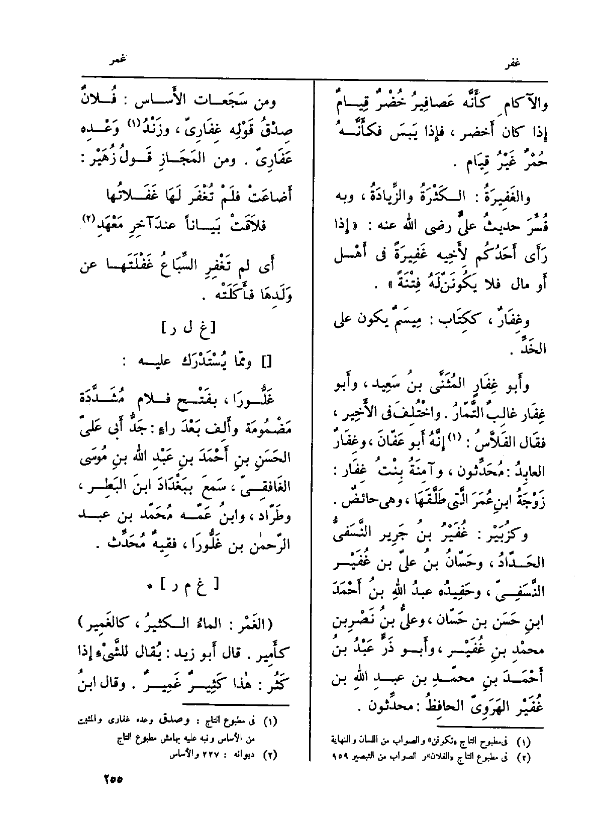 ِ والآكامِ كأَنَّه عَصافِيرُ خُضْرٌ قِيامٌ إِذا كَانَ أَخضر، فإِذا يَبسَ فكأَنَّهُ حُمْرٌ غَيْرُ قِيَام. والغَفِيرَةُ: الكَثْرَةُ والزِّيادَةُ، وَبِه فُسِّرَ حديثُ عليٍّ رَضِي الله عَنهُ: إِذا رَأَى أَحَدُكُم لأَخِيه غَفِيرَةً فِي أَهْل أَو مَال فَلَا يَكُونَنّ لَهُ فِتْنَةً. وغِفَارٌ، ككِتَاب: مِيسَمٌ يكون على الخَدِّ. وأَبو غِفَارٍ المُثَنَّى بنُ سَعِيد، وأَبو غِفَار غالِبٌ التّمّارُ. واخْتُلِف فِي الأَخِير، فقَال الفَلاَّسُ: إِنَّهُ أَبو عَفّانَ، وغِفَارٌ العابِدُ: مُحَدِّثون، وآمِنَةُ بِنْتُ غِفَار: زَوْجَةُ ابنِ عُمَرَ الَّتي طَلَّقَهَا، وَهِي حائضٌ. وكزُبَيْر: غُفَيْرُ بنُ جَرِير النَّسَفيُّ الحَدّادُ، وحَسّانُ بنُ عليّ بن غُفَيْر النَّسَفِيّ، وحَفِيدُه عبدُ اللهِ بنُ أَحْمَدَ ابنِ حَسَن بن حَسّان، وعليُّ بنُ نَصْرِ بن محمْدِ بنِ غُفَيْر، وأَبو ذَرٍّ عَبْدُ بنُ أَحْمَدَ بن محمّدِ بن عبدِ اللهِ بن غُفَيْر الهَرَوِيّ الحافِظُ: محدِّثون. وَمن سَجَعات الأَساس: فُلانٌ صِدْقُ قَوْلِه غِفَارِىّ، وزَنْدُ وَعْدِه عَفَارِيّ. وَمن المَجَازِ قَوْلُ زُهَيْر: