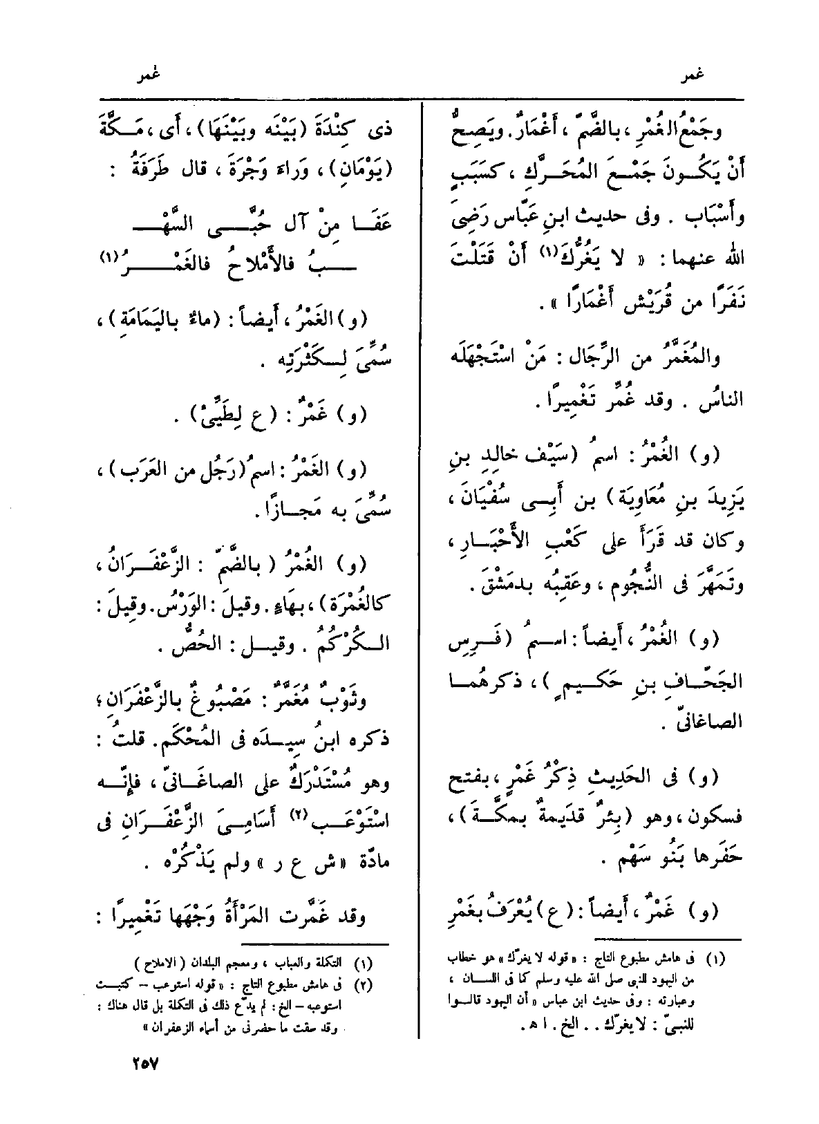الصاغانيّ. وَفِي الحَدِيثِ ذِكْرُ غَمْر، بِفَتْح فَسُكُون، وَهُوَ بِئرٌ قَديمةٌ بمكَّةَ، حَفَرها بَنُو سَهْم.