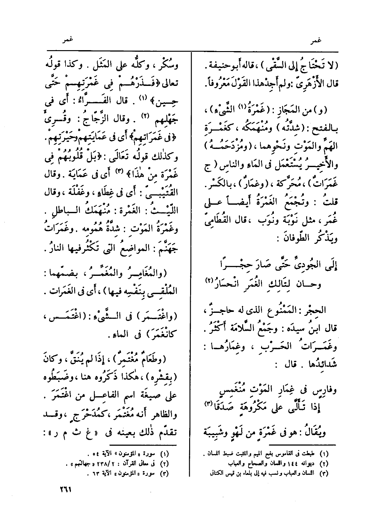 ويُقَالُ: هُوَ فِي غَمْرَةٍ من لَهْوٍ وشَبِيبَة وسُكْر، وكلُّه على المَثَل. وَكَذَا قولُه تَعَالَى: فَذَْرُهْم فِي غَمْرَتِهِمْ حَتَّى حِين. قَالَ الفَرَّاءُ: أَي فِي جَهْلِهِم. وَقَالَ الزَّجّاجُ: وقُرِئَ فِي غَمَرَاتِهِمْ أَي فِي عَمَايَتِهمْ وحَيْرَتِهِمْ. وَكَذَلِكَ قولُه تَعَالَى: بَلْ قُلُوبُهُمْ فِي غَمْرَة مِنْ هذَا. أَي فِي عَمَايَة. وَقَالَ القُتَيْبيّ: أَي فِي غِطَاءٍ، وغَفْلَة، وَقَالَ اللّيْثُ: الغَمْرة: مُنْهَمَكُ الباطلِ. وغَمْرَةُ المَوْتِ: شِدَّةُ هُمُومِه. وغَمَرَاتُ جَهَنَّمَ: المواضِعث الَّتِي تَكْثُر فِيهَا النارُ. والمُغَامِرُ والمُغَمِّرُ، بضمّهما: المُلْقِى بِنَفْسِه فِيهَا، أَي فِي الغَمَرات. واغْتَمَر فِي الشَّيْءِ: اغْتَمَس، كانْغَمَرَ فِي الماءِ. وطَعَامٌ مُغْتَمِرٌ، إِذَا لم يُنَقَّ، وكانَ بقِشْرِه، هَكَذَا ذَكَرُوه هُنَا، وضَبَطُوه على صيغَة اسْم الفاعِل من اغْتَمَرَ.