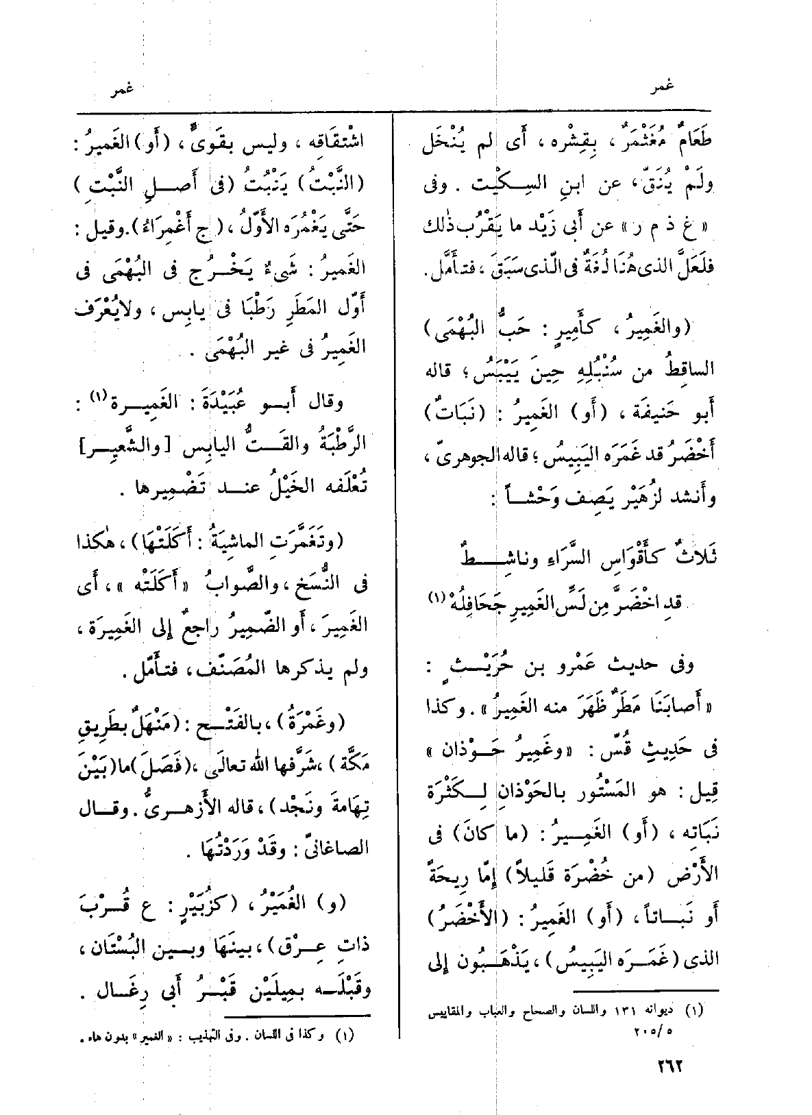 وَقَالَ أَبو عُبَيْدَةَ: الغَمِيرة: الرَّطْبَةُ والقَتُّ اليابِس والشَّعِير تُعْلَفه الخَيْلُ عِنْد تَضْمِيرها. وتَغَمَّرَتِ الماشِيَةُ: أَكَلَتْهَا، هَكَذَا فِي النُّسَخ، والصَّوابُ أَكَلَتْه، أَي الغَمِيرَ، أَو الضّمِيرُ راجعٌ إِلى الغَمِيرَة، وَلم يذكرهَا المُصَنّف، فتأَمّل. وغَمْرَةُ، بالفَتْح: مَنْهَلٌ بِطَرِيقِ مَكَّة، شَرَّفها الله تعالَى، فَصَلَ مَا بَيْنَ تِهامةَ ونَجْد، قَالَه الأزهريُّ. وَقَالَ الصاغانيّ: وقَدْ وَرَدْتُهَا. والغُمَيْرُ، كزُبَيْرٍ: ع قُرْبَ ذاتِ عِرْق، بينَهَا وَبَين البُسْتَان، وقضبْلَه بمِيلَيْن قَبْرُ أَبي رِغَال.