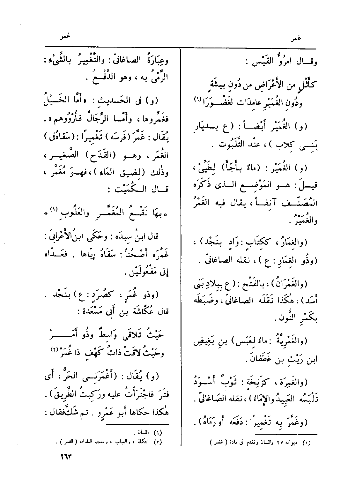 والغُمَيْر أَيضاً: ع بديَارِ بَنِي كِلاب، عنْد الثَّلَبُوت. والغُمَيْر: ماءٌ بأَجَأَ لِطَيئ، قيلَ: هُوَ المَوْضِع الَّذِي ذَكَرَه المُصَنّف آنِفاً، يُقَال فِيهِ الغَمْرُ والغُمَيْرُ. والغِمَارُ، ككِتَابٍ: وَادٍ بنَجْد، وذُو الغِمَارِ: ع، نَقله الصاغانيّ. والغَمْرَانُ، بالفَتْح: ع بِبِلاد بَنِي أَسَد، هَكَذَا نَقَلَه الصاغانيّ، وضَبَطَه بِكَسْر النُّون. والغَمْرِيَّةُ: ماءٌ لِعَبْس بنِ بَغِيضِ ابْن رَيْثِ بن غَطَفانَ. والغَمْرَة، كزِنْخَةٍ: ثَوْبٌ أَسْوَدُ تَلْبَسُه العَبِيدُ والإِماءُ، نَقله الصاغانيّ. وغَمَّرَ بِه تَغْمِيراً: دَفَعَه أَو رَمَاهُ. وعِبَارَةُ الصاغانيّ: والتَّغْمِيرُ بالشَّيْءِ: الرَّمْيُ بِهِ، وَهُوَ الدَّفْعُ. وَفِي الحَدِيثِ: أَمَّا الخَيْلُ فَغَمَّروها، وأَمّا الرّجَالُ فأَرْوُوهم. يُقَال: غَمَّرَ فَرسَه تَغْمِيراً: سَقاهُ فِي الغُمَر، وَهُوَ القَدَح الصَّغير، وَذَلِكَ لِضيق المَاءِ فَهُوَ مُغَمَّر، قَالَ الكُمَيْت: بهَا نَقْعُ المُغَمَّرِ والعَذُوبِ. قَالَ ابنُ سِيدَه: وحَكَى ابنُ الأَعرابيّ: غَمَّرَه أَصْحُناً: سَقَاهُ إِيّاها. فعَدّاه إِلى مَفْعُولَيْن. وَذُو غُمَرٍ، كصُرَدٍ: ع بنَجءد. قَالَ عُكّاشَة بن أَبي مَسْعَدة: