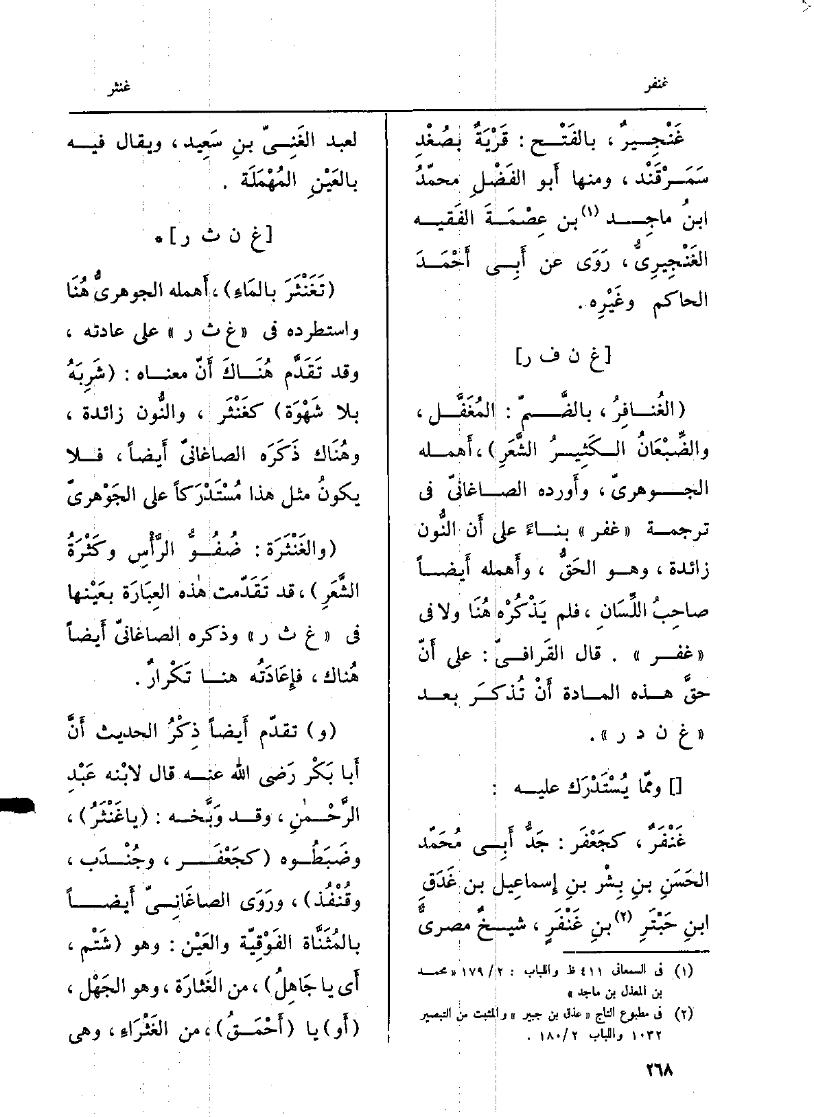 . تَغَنْثَرَ بالمَاءِ، أَهمله الجوهريُّ هُنَا واستطرده فِي غ ث ر على عَادَته، وَقد تَقَدَّم هُنَاكَ أَنّ مَعْنَاهُ: شَرِبَهُ بِلَا شَهْوَة كغَنْثَر، والنُّون زَائِدَة، وهُنَاك ذَكَرَه الصاغانيّ أَيضاً، فَلَا يكونُ مثل هَذَا مُسْتَدْرَكاً على الجَوْهريّ والغَنْثَرضة: ضُفُوُّ الرَّأْسِ وكَثْرَةُ الشَّعَرِ، قد تَقَدّمت هَذِه العِبَارَة بعَيْنها فِي غ ث ر وَذكره الصاغانيّ أَيضاً هُناك، فإِعَادَتُه هُنَا تَكْرارٌ. وتقدّم أَيضاً ذِكْرُ الحَدِيث أَنَّ أَبا بَكْر رَضِي الله عَنهُ قَالَ لابْنه عَبْدِ الرَّحْمنِ، وَقد وَبَّخه: يَا غَنْثَرُ، وضَبَطُوه كجَعْفَر، وجُنْدَب، وقُنْفُذ، ورَوَى الصاغَانِيّ أَيضاً بالمُثَنَّاة الفَوْقِيّة والعَيْن: وَهُوَ شَتْم، أَي جَاهِلُ، من الغَثارَة، وَهُوَ الجَهْل، أَو يَا أَحْمَقُ، من الغَثْرَاءِ، وَهِي