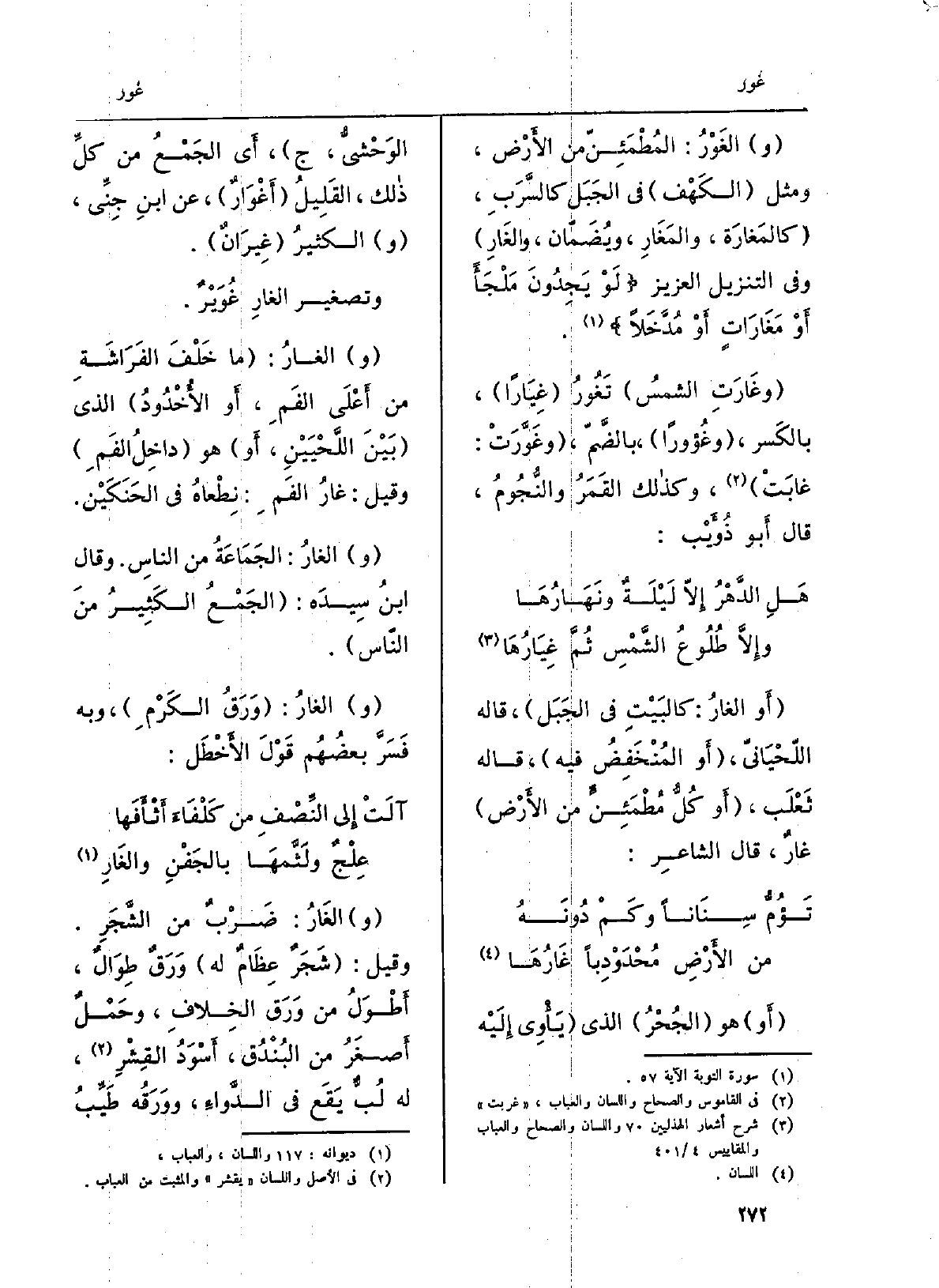 والغَوْرُ المُطْمَئِنّ من الأَرْض، وَمثل الكَهف فِي الجَبَل كالسَّرَبِ، {كالمَغَارَة،} والمَغَارِ، ويُضَمّان، {والغَارِ وَفِي التَّنْزِيل الْعَزِيز لَوْ يَجِدُونَ مَلْجَأَ أَو} مَغَارَاتٍ أَوْ مُدَّخَلاً. {وغَارَتِ الشمسُ} تَغُورُ {غِيَاراً، بالكَسر،} وغُؤوراً، بالضَّمّ، {وغَوَّرَتْ: غابَتْ، وَكَذَلِكَ القَمَرُ والنُّجُومُ، قَالَ أَبو ذُؤَيْب: