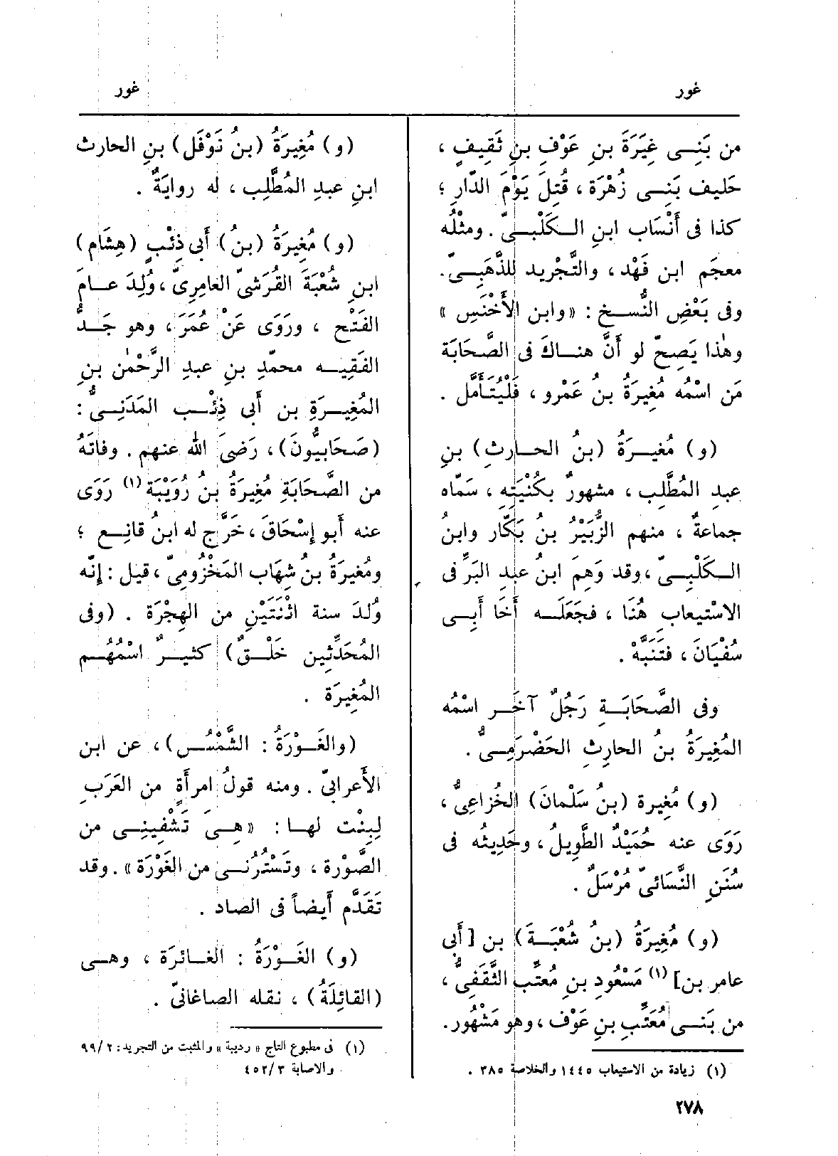 ومُغيرَةُ بنُ الحارثِ بنِ عبدِ المُطَّلِب، مشهورٌ بكُنْيَتِهِ، سَمّاه جماعةٌ، مِنْهُم الزُّبَيْرُ بنُ بَكّار وابنُ الكَلْبِيّ، وَقد وَهِمَ ابنُ عبدِ البَرِّفي الاسْتِيعابِ هُنَا، فجَعَلَه أَخَا أَبِي سُفْيَانَ، فتَنَبَّهْ. وَفِي الصَّحَابَةِ رَجُلٌ آخَر اسْمُه {المُغِيرَةُ بنُ الحارِثِ الحَضْرَمِيُّ. ومُغِيرة بنُ سَلْمانَ الخُزاعِيُّ، رَوَى عَنهُ حُمَيْدٌ الطَّوِيلُ، وحَدِيثُه فِي سُنَنِ النَّسَائيّ مُرْسَلٌ. ومُغِيرَةُ بنُ شُعْبَةَ بن أَبي عَامر بن مَسْعُودِ بنِ مُعتِّب)