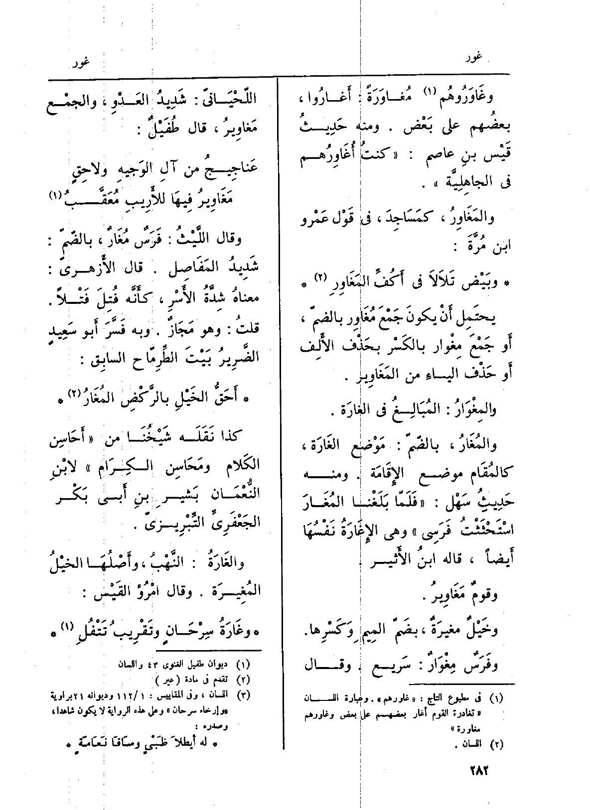 وفَرَسٌ {مِغْوَارٌ: سَريع. وَقَالَ اللّحْيَانيّ: شَدِيدُ العَدْوِ، والجمْع} مَغاوِيرُ، قَالَ طُفَيْلٌ: