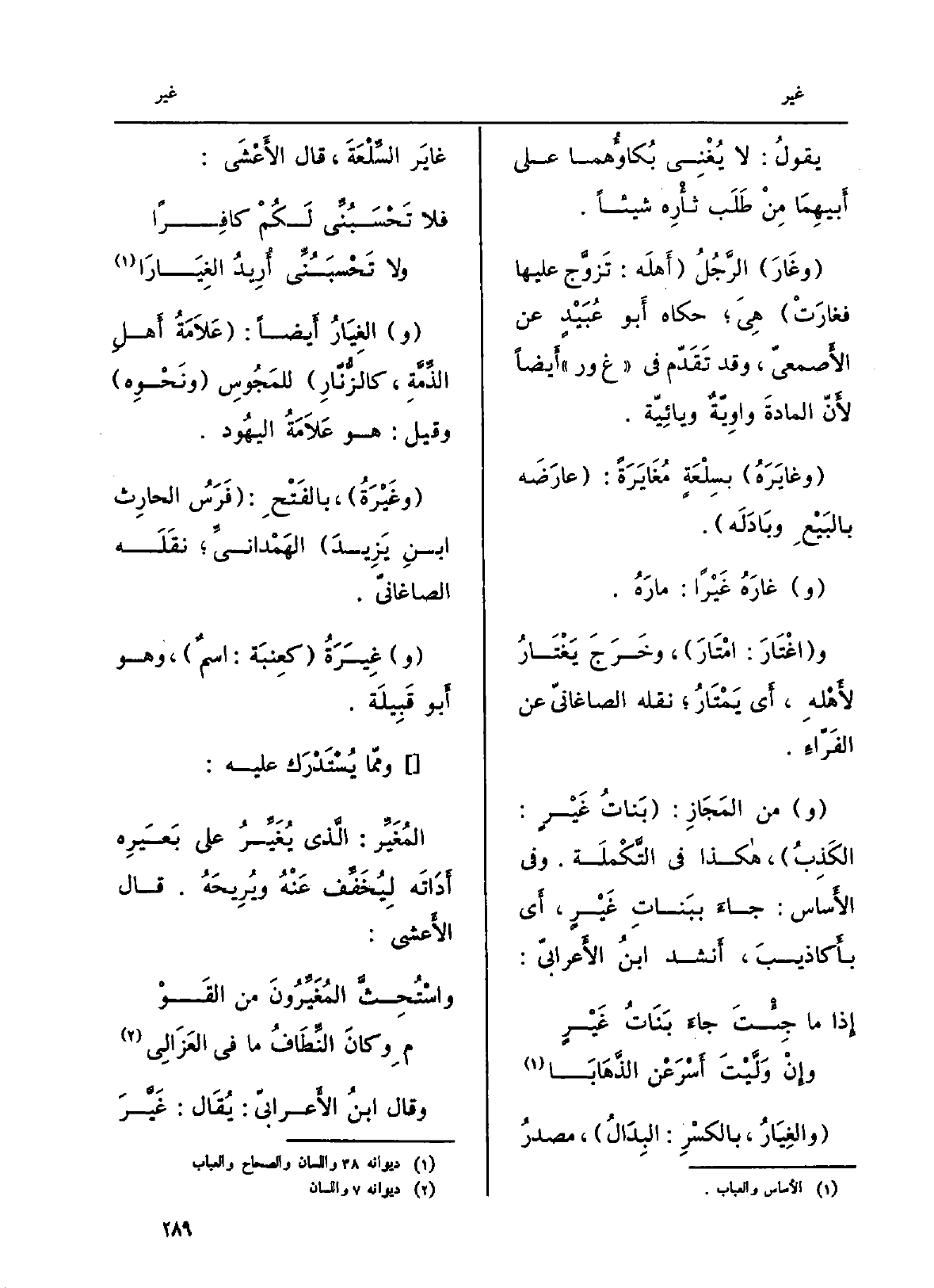 يقولُ: لَا يُغْنِى بُكاؤُهما على أَبيهِمَا مِنْ طَلَب ثأَرِه شَيْئا. وغَارَ الرَّجُلُ أَهْلَه: تَزوَّج عَلَيْهَا فغَارَتْ هِيَ حَكَاهُ أَبو عُبضيْدٍ عَن الأَصمعيّ، وَقد تَقَدّم فِي غ ور أَيضاً لأَنّ المادَة واوِيّةٌ ويائِيّة. {وغايرَهُ بِسلْعَةٍ} مُغَايَرَةً: عارَضَه بالبَيْعِ وبَادَلَه. {وغارَهُ} غَيْراً: مارَهُ. {واغْتَارَ: امْتَارَ،)