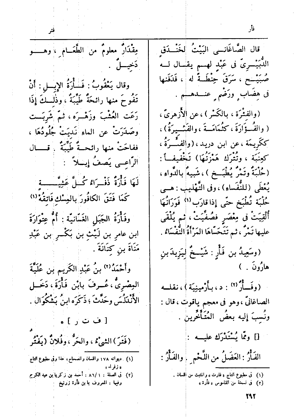 قَالَ الصَّاغَاني البَيْتُ لخَنْدَقٍ الدُّبَيْرِيّ فِي عَبْدٍ لَهُم يُقَال لَهُ صُبَيْح، سَرَقَ حِنْطَةً لَهُ، فَدَفَنها فِي هِضَابٍ ورَضْمٍ عِنْدهم. {والفِئْرَة، بالكَسْر، عَن الأَزهريّ،} والفُؤَارَةَ، كثُمَامَةَ، والفَئِيرَةُ، ككَرِيمَة، عَن ابْن دُرَيْد، والفِئْرَةُ، كعِنْبَة، وتُتْرَك هَمْزَتُهَا تَخْقيفاً: حُلْبَةٌ وتَمْرٌ يُطْبَخ، شَبيهٌ بالدَّواءِ، يُعْطَي للنُّفَساءِ، وَفِي التَّهذيب: هِيَ حُلْبَة تُطْبَخ حتّى إِذا قارَب فَوَرَانُهَا أُلْقِيَتْ فِي مِعْصَرٍ فصُفِّيَتْ، ثمَّ) يُلْقَى عَلَيْهَا تَمْرٌ، ثمَّ تَتَحَسّاهَا المَرْأَةُ النُّفْسَاءُ. وسَعِيدُ بن فَأْرٍ: شَيْخٌ لِيَزِيدَ بنِ هارُونَ. وفَأْرٌ: د، بأَرْمينِيَة، نَقله الصاغانيّ، وَهُوَ فِي مُعْجم ياقوت، قَالَ ونُسِبَ إِليه بعضُ المُتَأَخِّرين. وممّا يُسْتَدْرَك عَلَيْهِ: الفَأْرُ: العَضَلُ من اللَّحْمِ. والفَأْرُ: مِقْدَارٌ معلومٌ من الطَّعَامِ، وَهُوَ دَخِيلٌ. وَقَالَ يَعْقُوبُ: فَأْرَةُ الإِبِلِ: أَنْ تَفُوحَ مِنْهَا رائحَةٌ طَيِّبَةٌ، وذلِكَ إِذَا رَعَت العُشْبَ وزَهْرَه، ثمّ شَرِبَت وصَدَرَتْ عَن الماءِ نَدِيَتْ جُلُودُهَا، ففاحَتْ مِنْهَا رائحةٌ طَيِّبَةٌ. قَالَ الرَّاعِي يَصفُ إِبلاً:
