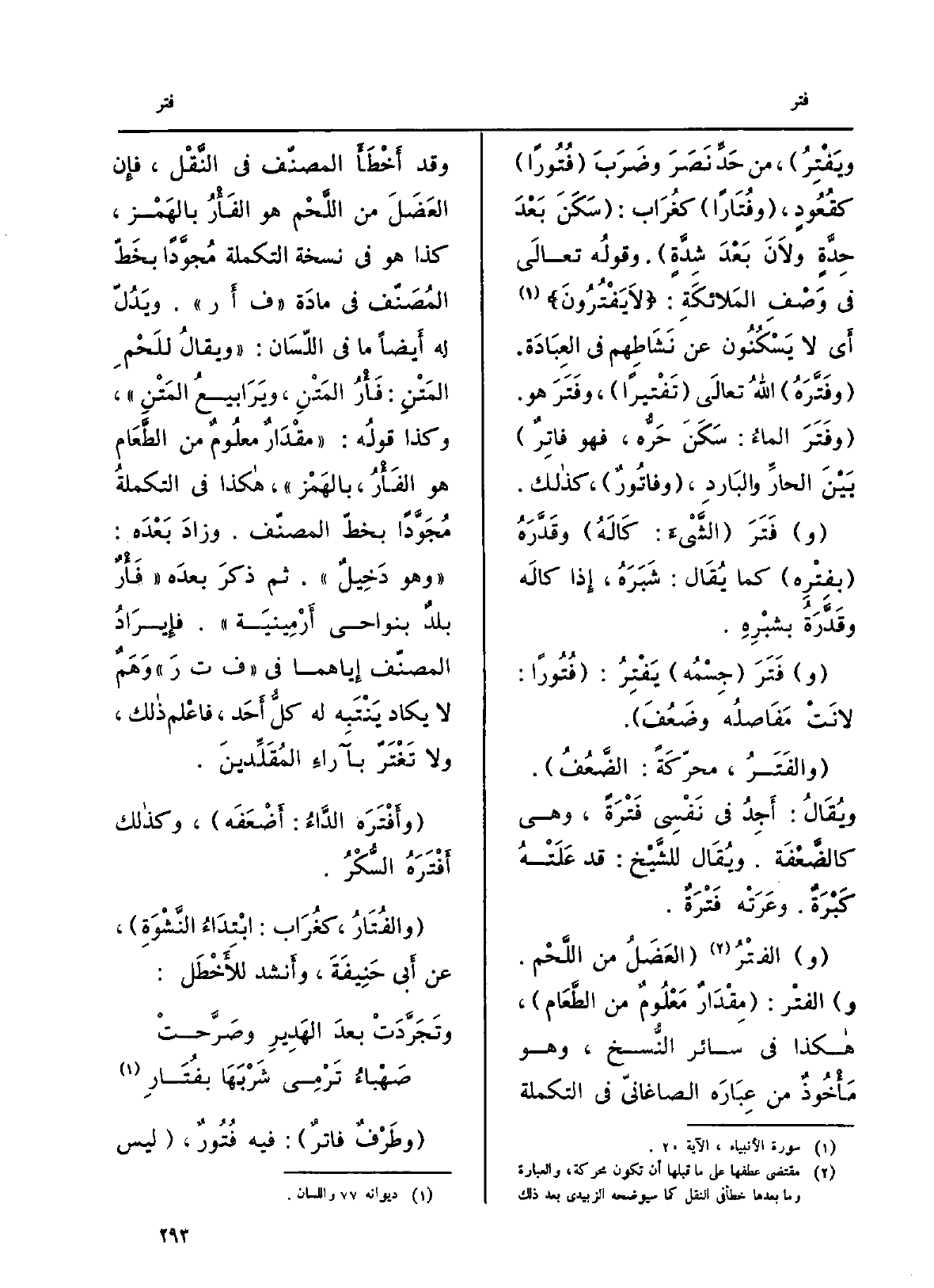 ويَفْتِرُ، من حَدِّ نَصَرَ وضَرَبَ فُتُوراً كقُعُودٍ، وفُتَاراً كغُرَاب: سَكَنَ بَعْدَ حِدَّةٍ ولاَنَ بَعْدَ شِدَّةٍ. وقولُه تعالَى فِي وَصْفِ المَلائكَةِ: لَا يَفْتُرُونَ. أَي لَا يَسْكُنُون عَن نَشَاطِهم فِي العِبَادَة. وفَتَّرَهُ اللهُ تعالَى تَفْتِيراً، وفَتَرَ هُوَ. وفَتَرَ الماءُ: سَكَنَ حَرُّه، فَهُوَ فاترٌ بَيْنَ الحارِّ والبَاردِ، وفاتُورٌ، كَذَلِك. وفَتَرَ الشَّيْءَ: كَالَهُ وقَدَّرَهُ بفِتْرِه كَمَا يُقَال: شَبَرَهُ، إِذا كالَه وقَدَّرَةُ بشبْرِه. وفَتَرَ جِسْمُه يَفْتِرُ: فُتُوراً: لانَتْ مَفَاصلُه وضَعُفَ. والفَتَرُ، محرّكَةً: الضَّعُفُ. ويُقَال: أَجِدُ فِي نَفْسِي فَتْرَةً، وَهِي كالضَّعْفَة. ويُقَال للشَّيْخ: قد عَلَتْهُ كَبْرَةٌ. وعَرَتْه فَتْرَةٌ. والفتْرُ العَضَلُ من اللَّحْم. والفتْر: مِقْدَارٌ مَعْلُومٌ من الطَّعَام، هَكَذَا فِي سَائِر النُّسخ، وَهُوَ مَأْخُوذٌ من عِبَارَة الصاغانيّ فِي التكملة وَقد أَخْطَأَ المصنّف فِي النَّقْل، فإِن العَضَلَ من اللَّحْم هُوَ الفَأْرُ بالهَمْز، كَذَا هُوَ فِي نُسْخَة التكملة مُجَّوداً بخَطّ المُصَنّف فِي مادَة ف أر. ويَدُلّ لَهُ أَيضاً مَا فِي اللّسَان: ويقالُ للَحْمِ المَتْنِ: فَأْرُ المَتْنِ، ويَرَابيعُ المَتْنِ، وَكَذَا قولُه: مقْدَارٌ معلُومٌ من الطَّعَام هُوَ الفَأْرُ، بالهَمْز، هَكَذَا فِي التكملة مُجَوَّداً بخطّ المصنّف. وزادَ بَعْدَه: وَهُوَ دَخِيل. ثمَّ ذكرَ بعدَه فَأْرٌ بلدٌ بنواحي أَرْمِينيَة. فإِيرَادُ المصنّف إِياهما فِي ف ت ر وَهَمٌ لَا يكَاد يَنْتَبِه لَهُ كلُّ أَحَد، فاعْلم ذَلِك، وَلَا تَغْتَرّ بآراءِ المُقَلِّدينَ. وأَفْتَرَه الدَّاءُ: أَضْعَفَه، وَكَذَلِكَ أَفْتَرَهُ السُّكْرُ. والفُتَارُ، كغُرَاب: ابْتِدَاءُ النَّشْوَةِ، عَن أَبي حَنِيفَةَ، وأَنشد للأَخْطَل: