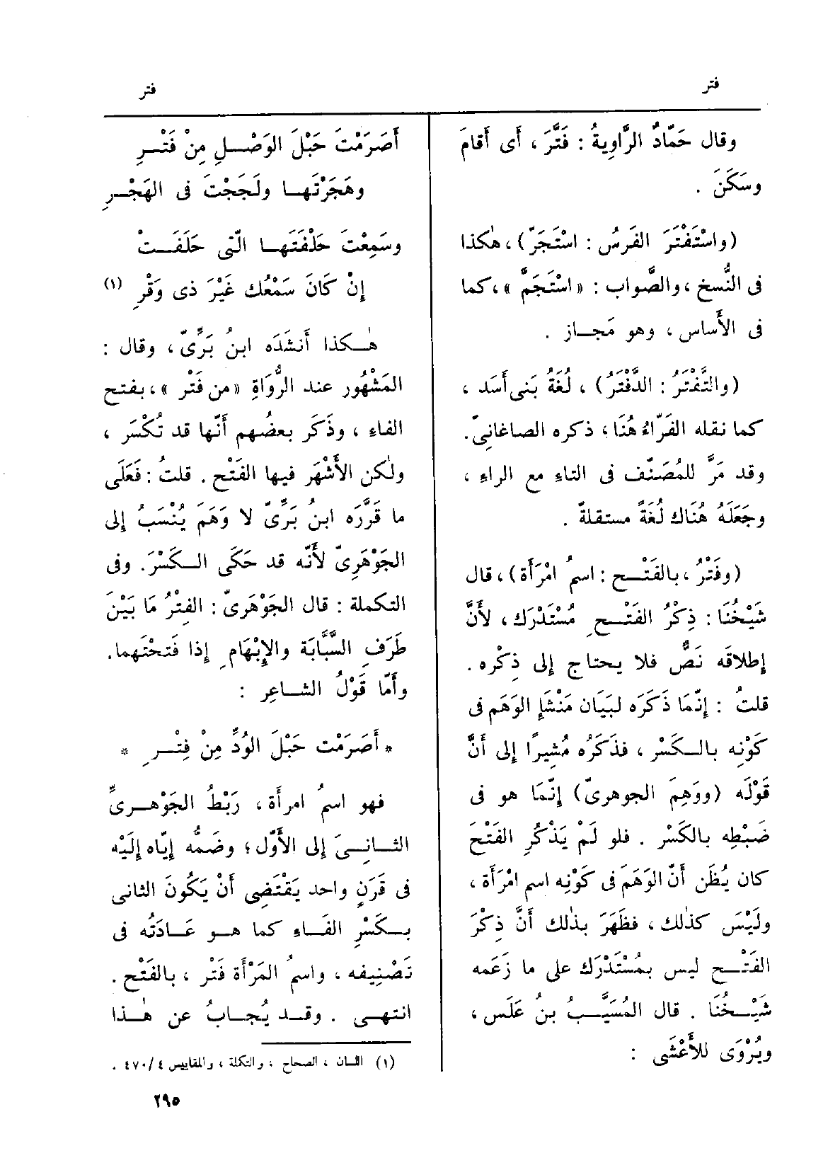 هَكَذَا أَنشَدَه ابنُ بَرِّيّ، وَقَالَ: المَشْهُور عِنْد الرُّوَاةِ من فَتْر، بِفَتْح الفاءِ، وذَكَر بعضُهم أَنّها قد تُكْسَر، وَلَكِن الأَشْهَر فِيهَا الفَتْح. قلتُ: فَعَلَى مَا قَرَّرَه ابنُ بَرِّيّ لَا وَهَمَ يُنْسَبُ إِلى الجَوْهَرِيّ)