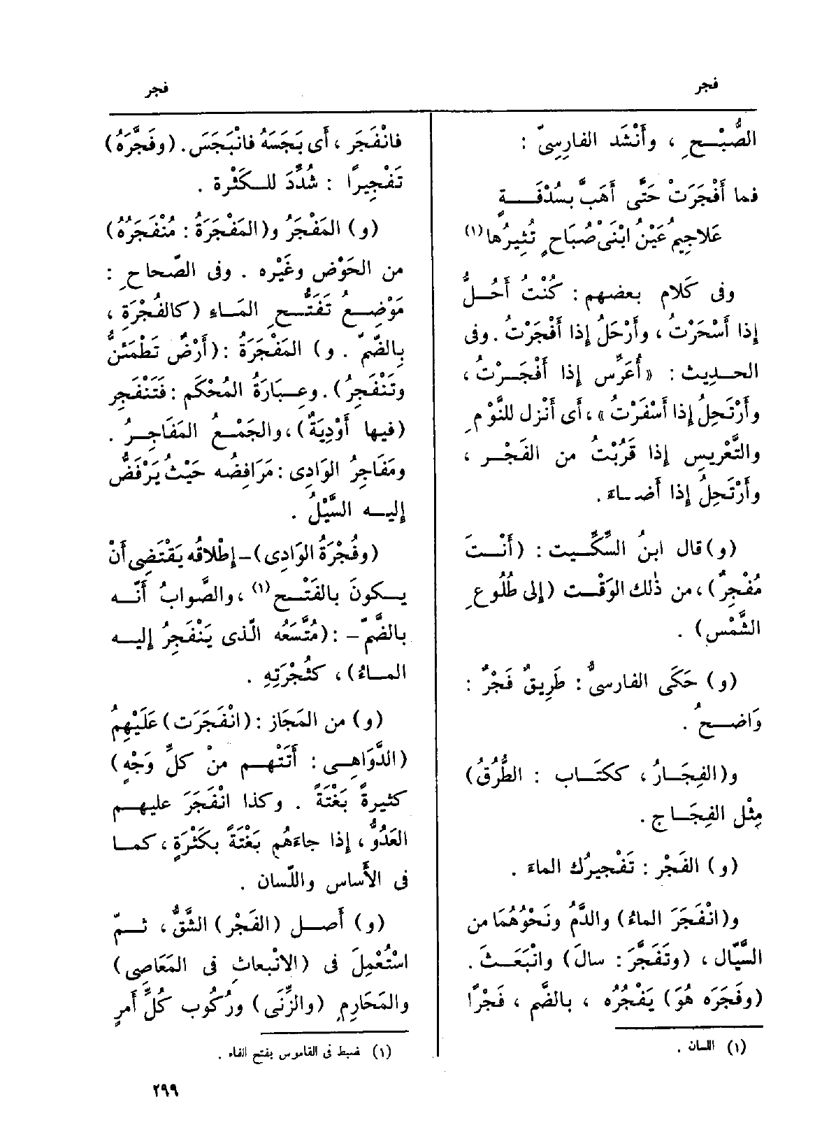 وَفِي كَلام بَعضهم: كُنْتُ أَحُلُّ إِذا أَسْحَرْتُ، وأَرْحَلُ إِذا أَفْجَرْتُ. وَفِي الحدِيث: أُعَرِّس إِذا أَفْجَرْتُ، وأَرْتَحِلُ إِذا أَسْفَرْتُ، أَي أَنْزل للنَّوْمِ والتَّعْرِيس إِذا قَرُبْتُ من الفَجْر، وأَرْتَحِلُ إِذا أَضاءَ. وَقَالَ ابنُ السِّكِّيت: أَنْتَ مُفْجِرٌ، من ذَلِك الوَقْت إِلى طُلُوعِ الشَّمْس. وحَكَى الفارسيُّ: طَرِيقٌ فَجْرٌ: وَاضحُ. والفِجَارُ، ككَتاب: الطُّرُقُ مِثْل الفِجَاج. والفَجْر: تَفجيرُك الماءَ. وانْفَجَرَ الماءُ والدَّمُ ونَحْوُهُمَا من السَّيّال، وتَفَجَّرَ: سالَ وانْبَعَثَ. وفَجَرَه هُوَ يَفْجُرُه، بالضَّم، فَجْراً فانْفَجَر، أَي بَجَسَهُ فانْبَجَسَ. وفَجَّرَهُ تَفْجِيراً: شُدِّدَ للكَثْرة. والمَفْجَرُ والمَفْجَرَةُ: مُنْفَجَرُهُ من الحَوْضِ وغَيْره. وَفِي الصّحاحِ: مَوْضِعُ تَفَتُّحِ المَاءِ كالفُجْرَةِ، بِالضّمّ. والمَفْجَرَةُ: أَرْضٌ تَطْمَئِنُّ وتَنْفَجِرُ. وعبَارَةُ المُحْكَم: فتَنْفَجِر فِيهَا أَوْدِيَةٌ، والجَمْعُ المَفَاجِرُ. ومَفَاجِرُ الوَادِي: مَرَافِضُه حَيْثُ يَرْفَضُّ إِليه السَّيْلُ. وفُجْرَةُ الوَادِي إِطْلاقُه يَقْتَضِي أَنْ يكونَ بالفَتْح، والصَّوابُ أَنّه بالضَّمّ مُتَّسَعُه الّذي يَنْفَجِرُ إِليه الماءُ، كثُجْرَتِهِ. وَمن المَجَاز: انْفَجَرَت عَلَيْهِمُ الدَّوَاهِي: أَتَتْهم من كلِّ وَجْهٍ كَثِيرَة بَغْتَةً. وَكَذَا انْفَجَرَ عَلَيْهِم العَدُوُّ، إِذا جاءَهُم بَغْتَةً بكَثْرَةٍ، كَمَا فِي الأَساس واللّسان.