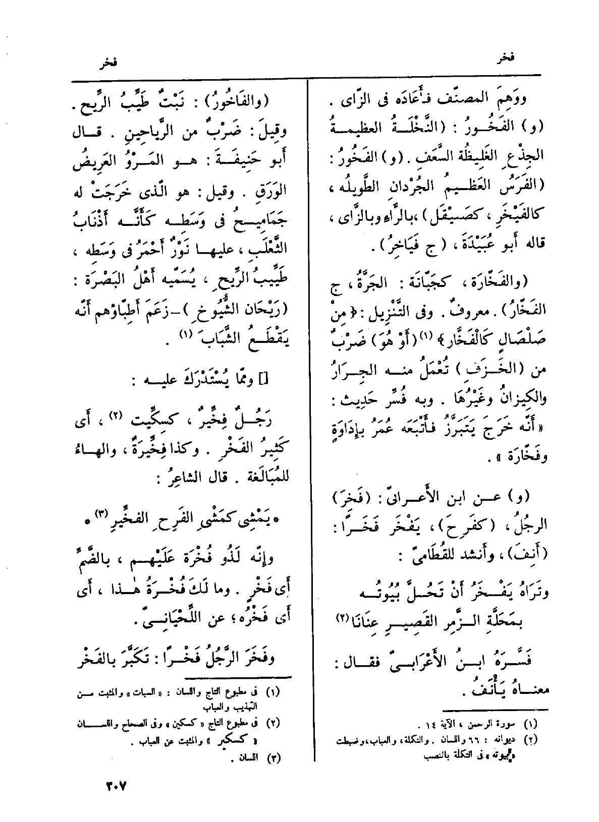 فَسَّرَُه ابنُ الأَعْرَابيّ فَقَالَ: معناهُ يَأْنَفُ. والفَاخُورُ: نَبْتٌ طَيِّبُ الرِّيح. وقِيلَ: ضَرْبٌ من الرِّياحينِ. قَالَ أَبو حَنِيفَةَ: هُوَ المَرْوُ العَرِيضُ الوَرَقِ. وَقيل: هُوَ الّذي خَرَجَتْ لَهُ جَمَامِيحُ فِي وَسَطِه كأَنَّه أَذْنَابُ الثَّعْلَبِ، عَلَيْهَا نَوْرٌ أَحْمَرُ فِي وَسَطِه، طَييبُّ الرِّيحِ، يُسَمّيه أَهْلُ البَصْرَة: رَيْحَان الشُّيُوخِ زَعَمَ أَطِبّاؤُهم أَنّه يَقْطَعُ الشَّبَابَ. وممّا يُسْتَدْرَكَ عَلَيْهِ: رَجُلٌ فَخِّيرٌ، كسِكِّيت،) أَي كَثِيرُ الفَخْرِ. وَكَذَا فِخِّيرَةٌ، والهاءُ للمُبَالَغة. قَالَ الشاعِرُ: يَمْشِي كمَشْيِ الفَرِحِ الفخِّيرِ. وإِنّه لَذُو فُخْرَة عَلَيْهم، بالضَّمِّ أَي فَخَرٍ. وَمَا لضكَ فُخْرَةُ هَذَا، أَي فَخْرُه عَن اللِّحْيَانِيّ. وفضخَرَ الرَّجُلُ فَخْراً: تَكَبَّر بالفَخْر