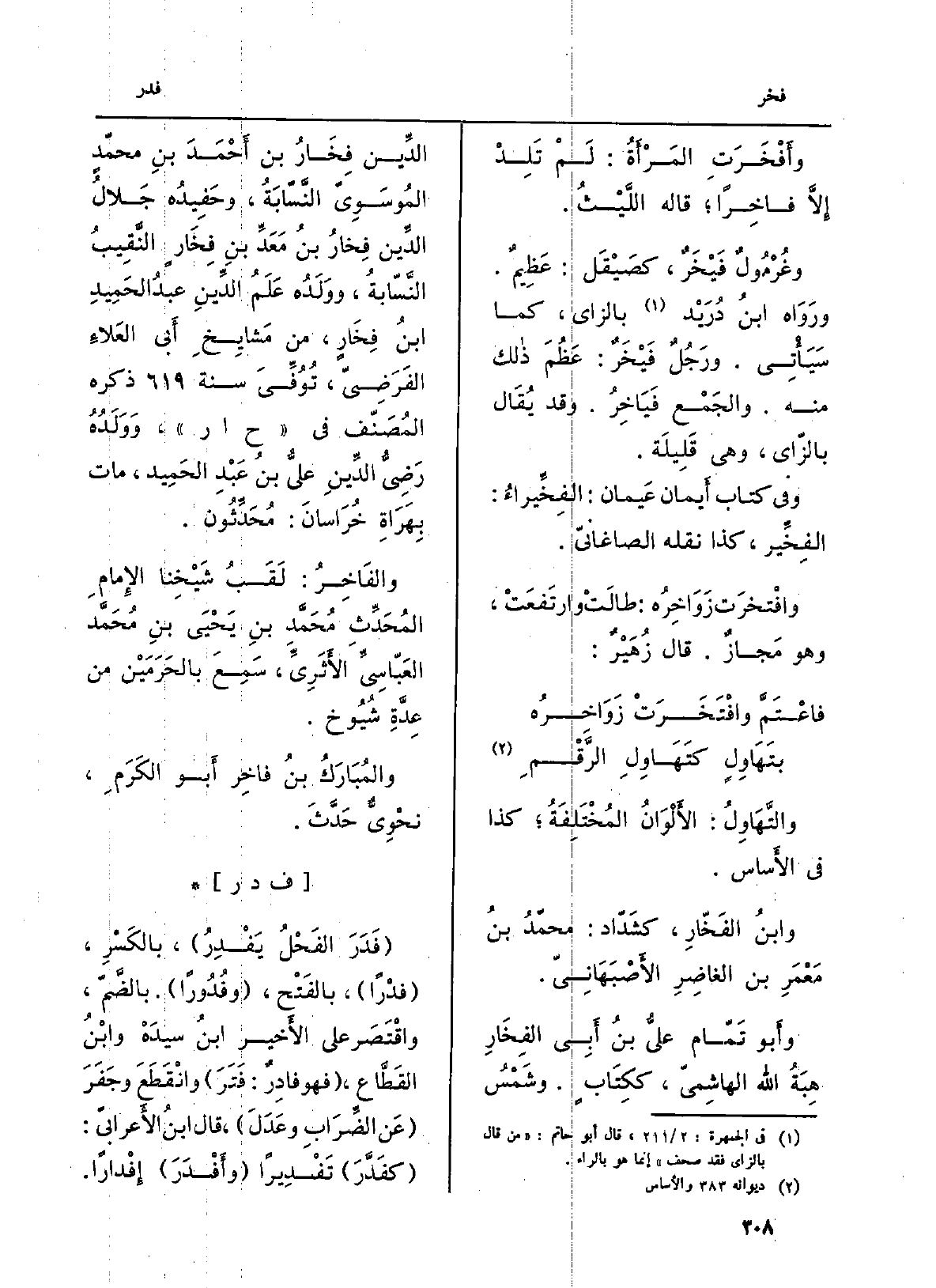 والفاخِرُ: لَقَبُ شَيْخِنا الإِمامِ المُحَدِّثِ مُحَمَّدِ بنِ يَحْيَى بنِ مُحَمَد العَبّاسِيِّ الأَثَرِيِّ، سَمِعَ بالحَرَمَيْن من عِدَّةِ شُيُوخ. والمُبَارَكُ بنُ فاخِر أَبو الكَرَمِ، نحْوِيٌّ حَدَّثَ.