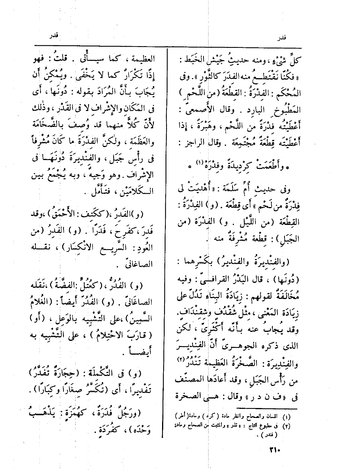 كلِّ شيْءٍ، وَمِنْه حديثُ جَيْش الخَبَط: فكُنّا نَقْتَطِعُ مِنْهُ الفِدَرَ كالثَّوْرِ. وَفِي المُحْكَم: الفِدْرَةُ: القِطْعَةُ من اللَّحْمِ المَطْبُوخِ البارِد. وَقَالَ الأصمعيّ: أَعْطَيْتُه فِدْرَةً من اللَّحْم، وهَبْرَةً، إِذا أَعْطَيْتَه قِطْعَةً مُجْتَمِعَة. وَقَالَ الراجز: وأَطْعَمَتْ كِرْدِيدَةً وفِدْرَهْ. وَفِي حديثِ أُمِّ سَلَمَة: أُهْديَتْ لي فِدْرَةٌ من لَحْم أَي قِطْعَة. والفِدْرَةُ: القِطْعَة من اللَّيْل. والفِدْرَة من الجَبَلِ: قِطْعة مُشْرِفَةٌ مِنْهُ. والفِنْدِيرَةُ والفِنْديرُ بكَسْرِهما: دُونَها، قَالَ البَدْرُ القرافيّ: وَفِيه مُخَالَفَةٌ لقَولهم: زِيَادَةُ البِنَاءِ تَدُلّ على زِيَادَة المَعْنَى، مشثْل شُقْدُفٍ وشِقْنْدَافٍ. وَقد يُجابُ عَنهُ بأَنّه أَكْثَرِىّ، لَكِن الَّذِي ذكره الْجَوْهَرِي أَنّ الفِنْدِيرَ والفِنْدِيرَة: الصَّخْرَةُ العَظِيمة تَنْدُرُ من رَأْس الجَبَلِ، وَقد أَعادَها المصنّف فِي ف ن د ر وَقَالَ: هِيَ الصَّخْرَة الْعَظِيمَة، كَمَا سَيَأْتِي. قلتُ: فَهُوَ إِذاً تَكْرَارٌ كَمَا لَا) يَخْفَى. ويُمْكِنُ أَن يُجَابَ بأَنَّ المُرَادَ بقوله: دُونَها، أَي فِي المَكَانِ والإِشْرافِ لَا فِي القَدْر، وَذَلِكَ لأَنّ كُلاًّ مِنْهُمَا قد وُصِفَ بالضَّخَامَة والعَظَمَةِ، ولكنَّ الفِدْرَةَ مَا كَانَ مُشْرِفاً فِي رأْسِ جَبَل، والفِنْدِيرَةَ دُونَهَا فِي الإِشْراف. وَهُوَ وَجيهٌ، وَبِه يُجْمَعُ بَين الكَلامَيْن، فتَأَمَّل. والفَدِرُ، ككَتِف: الأَحْمَقُ، وَقد فَدِرَ، كفَرِحَ، فَدَراً. والفَدِرُ من العُودِ: السَّرِيع الانْكِسَار، نَقله الصاغانيّ. والفُدُرُّ، كعُتُلٍّ: الفِضَّةُ، نَقَله الصاغَانيّ. والفُدُرّ أَيضاً: الغلُامُ السَّمِينُ، على التَّشْبِيه بالوَعِل، أَو قارَبَ الاحْتِلامُ، على التَّشْبِيه بِهِ أَيضاً. وَفِي التَّكْمِلَة: حِجَارَةٌ تُفَدَّرُ تَفْدِيراً، أَي تُكَسَّرُ صِغَاراً وكِبَاراً.