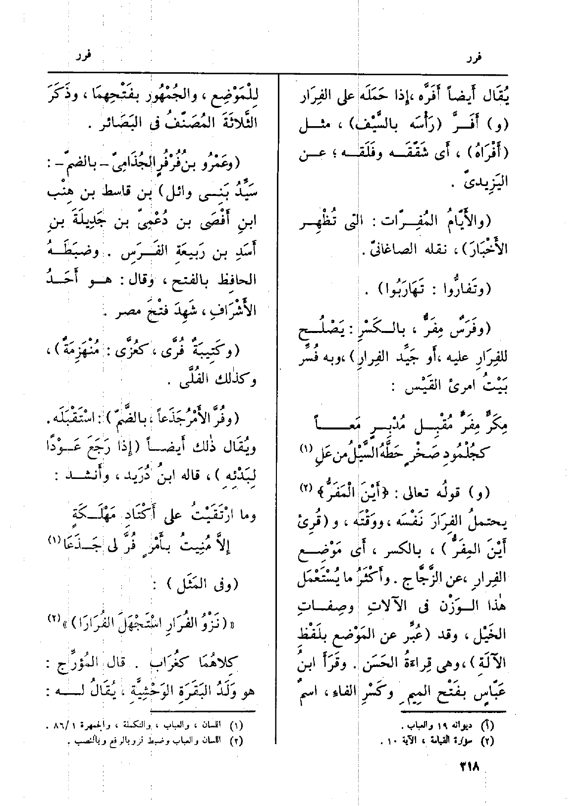 الفِرارِ، عَن الزِّجَّاج. وأَكْثَرُ مَا يُسْتَعْمَل هَذَا الوَزْن فِي الآلاتِ وصِفاتِ الخَيْل، وَقد عُبِّر عَن المَوْضع بلَفْظِ الآلَةِ، وَهِي قِراءَةُ الحَسَن. وقَرَأَ ابنُ عَبّاسٍ بفَتْح المِيمِ وكَسْرِ الفاءِ، اسمٌ لِلمَوْضِع، والجُمْهُور بفَتْحِهمَا، وذَكَرَ الثَّلاثَةَ المُصَنّفُ فِي البَصَائر. وعَمْرُو بن {فُرْفُرٍ الجُذَامِيّ بالضمّ: سَيِّدُ بَنِي وَائِل بن قاسط بن هِنْب ابنِ أَفْصَى بن دُعْمِىّ بن جَدِيلَةَ بنِ أَسَدِ بن رَبِيعَةِ الفَرَسِ.