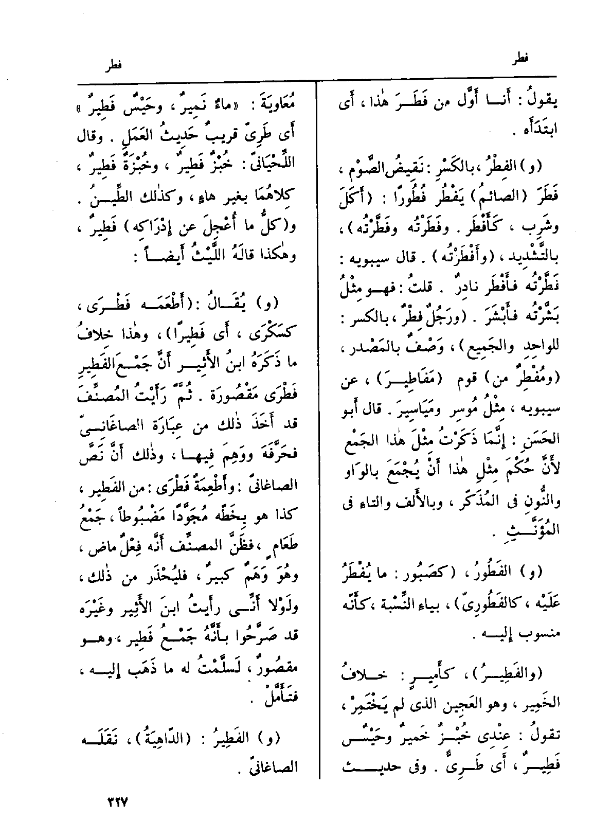 قَالَ أَبو الحَسَنِ: إِنَّمَا ذَكَرْتُ مِثْلَ هَذَا الجَمْع لأَنَّ حُكْمَ مِثْلِ هَذَا أَنْ يُجْمَعَ بالوَاو والنُّون فِي المُذَكّر، وبالأَلف والتاءِ فِي المُؤَنَّثِ. والفَطُورُ، كصَبُور: مَا يُفْطَرُ عَلَيْه، كالفَطُورِيّ، بياءِ النِّسْبة، كأَنّه مَنْسُوب إِليه. والفَطِيرُ، كأَمِيرٍ: خلافُ الخَمِير، وَهُوَ العَجِين الَّذِي لم يَخْتَمِرْ، تقولُ: عِنْدِي خُبْزٌ خَميرٌ وحَيْسٌ فَطِيرٌ، أَي طَرِيٌّ. وَفِي حَدِيث مُعَاويَةَ: ماءٌ نَمِيرٌ، وحَيْسٌ فَطِيرٌ أَي طَرِيّ قريبٌ حَدِيثُ العَمَلِ. وَقَالَ اللَّحْيَانيّ: خُبْزٌ فَطِيرٌ، وخُبْزَةٌ فَطِيرٌ، كِلاهُمَا بِغَيْر هاءٍ، وَكَذَلِكَ الطِّينُ. وكلُّ مَا أُعْجِلَ عَن إِدْرَاكِه فَطِيرٌ، وَهَكَذَا قالَهُ اللَّيْثُ أَيضاً: ويُقَالُ: أَطْعَمَه فَطْرَي، كسَكْرَى، أَي فَطِيراً، وَهَذَا خِلافُ مَا ذَكَرَهُ ابنُ الأَثِير أَنَّ جَمْعَ الفَطِيرِ فَطْرَى مَقْصُورَة، ثُمَّ رَأَيْتُ المُصنِّفَ قد أَخَذَ ذَلِك من عِبَارَة الصاغَانِيّ فحَرَّفَهَ ووَهِمَ فِيهَا، وَذَلِكَ أَنَّ نَصَّ الصاغانيّ:)