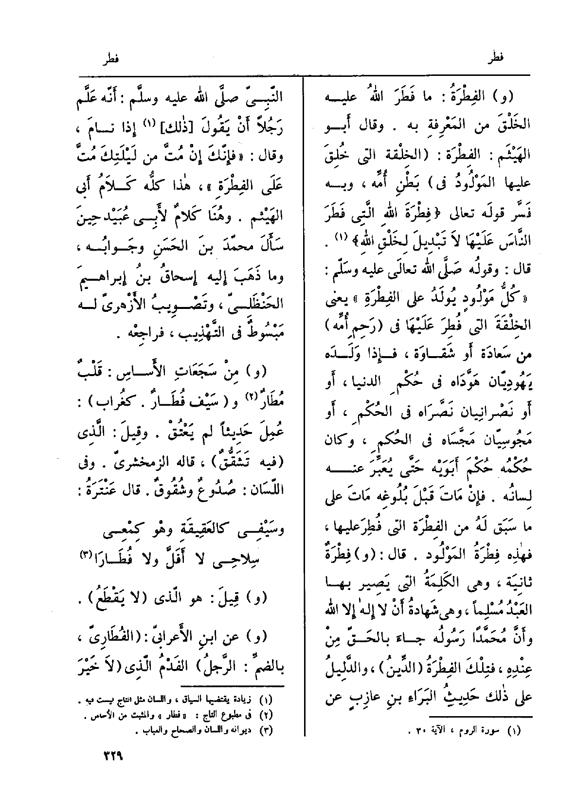 والفِطْرَةُ: مَا فَطَرَ اللهُ عَلَيْهِ الخَلْقَ من المَعْرِفةِ بِهِ. وَقَالَ أَبو الهَيْثَم: الفِطْرَة: الخِلْقة الَّتِي خُلِقَ عَلَيْهَا المَوْلُودُ فِي بَطْنِ أُمِّه، وَبِه فَسَّر قولَه تَعَالَى: فِطْرَةَ اللهِ الَّتِي فَطَرَ النَّاسَ عَلَيْهَا لَا تَبْدِيلَ لِخَلْقِ اللهِ. قَالَ: وقولُه صَلَّى الله تعالَى عَلَيْهِ وسَلّم: كُلُّ مَوْلُودٍ يُولَدُ على الفِطْرَةِ يَعْنِي الخِلْقَةَ الَّتِي فُطِرَ عَلَيْهَا فِي رَحِمِ أُمِّه من سَعادَة أَو شَقاوَة، فإِذا وَلَدَه يَهُودِيّان هَوَّدَاه فِي حُكْمِ الدُّنْيَا، أَو نَصْرانِيان نَصَّرَاه فِي الحُكْمِ، أَو مَجُوسِيّان مَجَّسَاه فِي الحُكمِ، وَكَانَ حُكْمُه حُكْمَ أَبَوَيْه حَتَّى يُعَبِّرَ)
