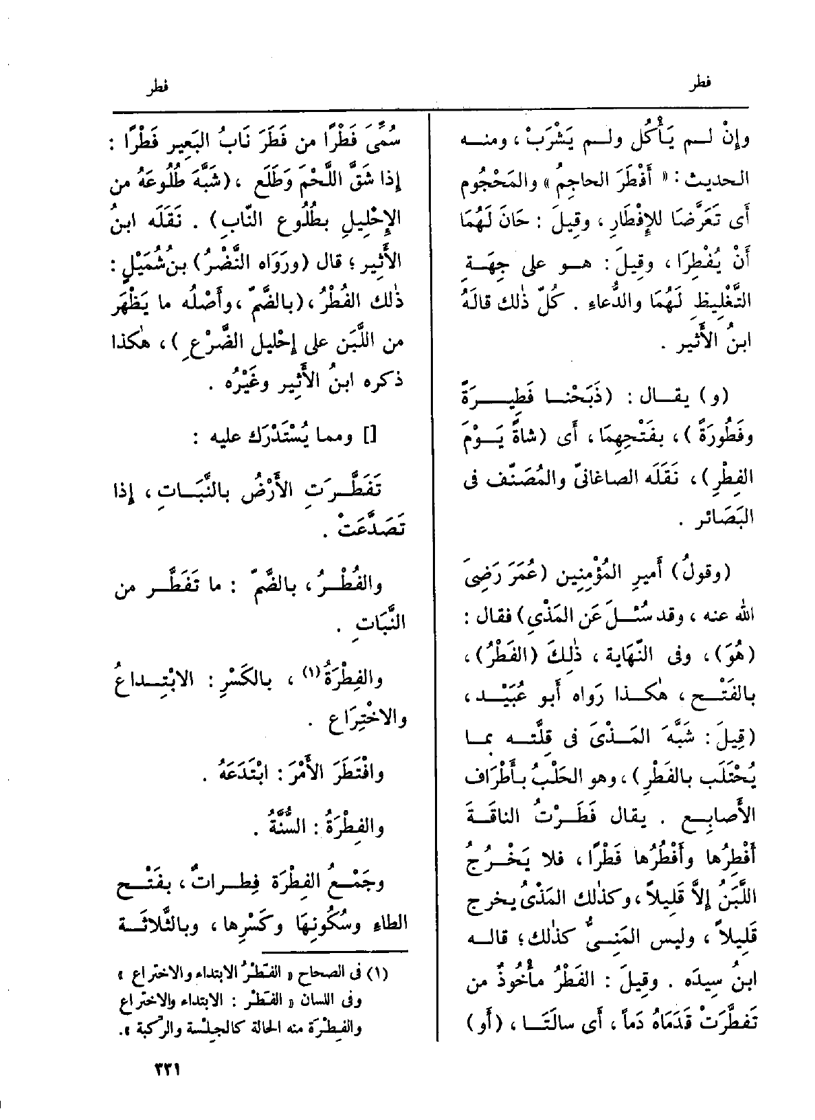وإِنْ لم يَأْكُل وَلم يَشْرَبْ، وَمِنْه الحَدِيث: أَفْطَرَ الحاجِمُ والمَحْجُوم أَي تَعَرَّضَا للإِفْطَارِ، وقِيلَ: حَانَ لَهُمَا أَن يُفْطِرَا، وقِيلَ: هُوَ على جِهَةِ التَّغْلِيظِ لَهُمَا والدُّعاءِ. كُلّ ذَلِك قالَهُ ابنُ الأَثير. وَيُقَال: ذَبَحْنا فَطِيرَةً وفَطُورَةً، بفَتْحِهِمَا، أَي شَاة يَوْمَ الفِطْرِ، نَقَلَه الصاغانيّ والمُصَنّف فِي البَصَائر. وقولُ أَميرِ المُؤْمِنِين عُمَرَ رَضِيَ الله عَنهُ، وَقد سُئلَ عَن المَذْيِ فَقَالَ: هُوَ، وَفِي النّهَاية، ذلِكَ الفَطْرُ، بالفَتْح، هَكَذَا رَواه أَبو عُبَيْد، قِيلَ: شَبَّهَ المَذْيَ فِي قِلَّته بِمَا يُحْتَلَب بالفَطْرِ، وَهُوَ الحَلْبُ بأَطْرَاف الأَصابِع. يُقَال فَطَرْتُ الناقَةَ أَفْطِرُها وأَفْطُرُها فَطْراً، فَلَا يَخْرُجُ اللَّبَنُ إِلاَّ قَلِيلاً، وَكَذَلِكَ المَذْيُ يخرج قَلِيلاً، وَلَيْسَ المَنِىُّ كَذَلِك قَالَه ابنُ سِيدَه. وقِيلَ: الفَطْرُ مأْخُوذ من تَفَطَّرَتْ قَدَمَاهُ دَماً، أَي سَالَتَا، أَو سُمِّيَ فَطْراً من فَطَرَ نَابُ البَعِير فَطْراً: إِذا شَقَّ اللَّحْمَ وَطَلَع، شَبَّهَ طُلُوعَهُ من الإِحْلِيلِ بطُلُوع النّابِ. نَقَلَه ابنُ الأَثِير قَالَ ورَوَاه النَّضْرُ بنُ شُمَيْلٍ: ذَلِك الفُطْرُ، بالضَّمّ، وأَصْلُه مَا يَظْهَر من اللَّبَن على إِحْليل الضَّرْعِ، هَكَذَا ذكره ابنُ الأَثِير وغَيْرُه. وَمِمَّا يُستَدْرَك عَلَيْهِ: تَفَطَّرَتِ الأَرْضُ بالنَّبَاتِ، إِذا تَصَدَّعَتْ. والفُطْرُ، بالضَّمّ: مَا تَفَطَّر من النَّبَاتِ. والفِطْرَةُ، بالكَسْرِ: الإبْتِداعُ والاخْتِرَاع. وافْتَطَرَ الأَمْرَ: ابْتَدَعَهُ. والفِطْرَةُ: السُّنَّةُ. وجَمْعُ الفِطْرَة فِطراتٌ، بفَتْح الطاءِ وسُكُونِهَا وكَسْرِها، وبالثَّلاثَة