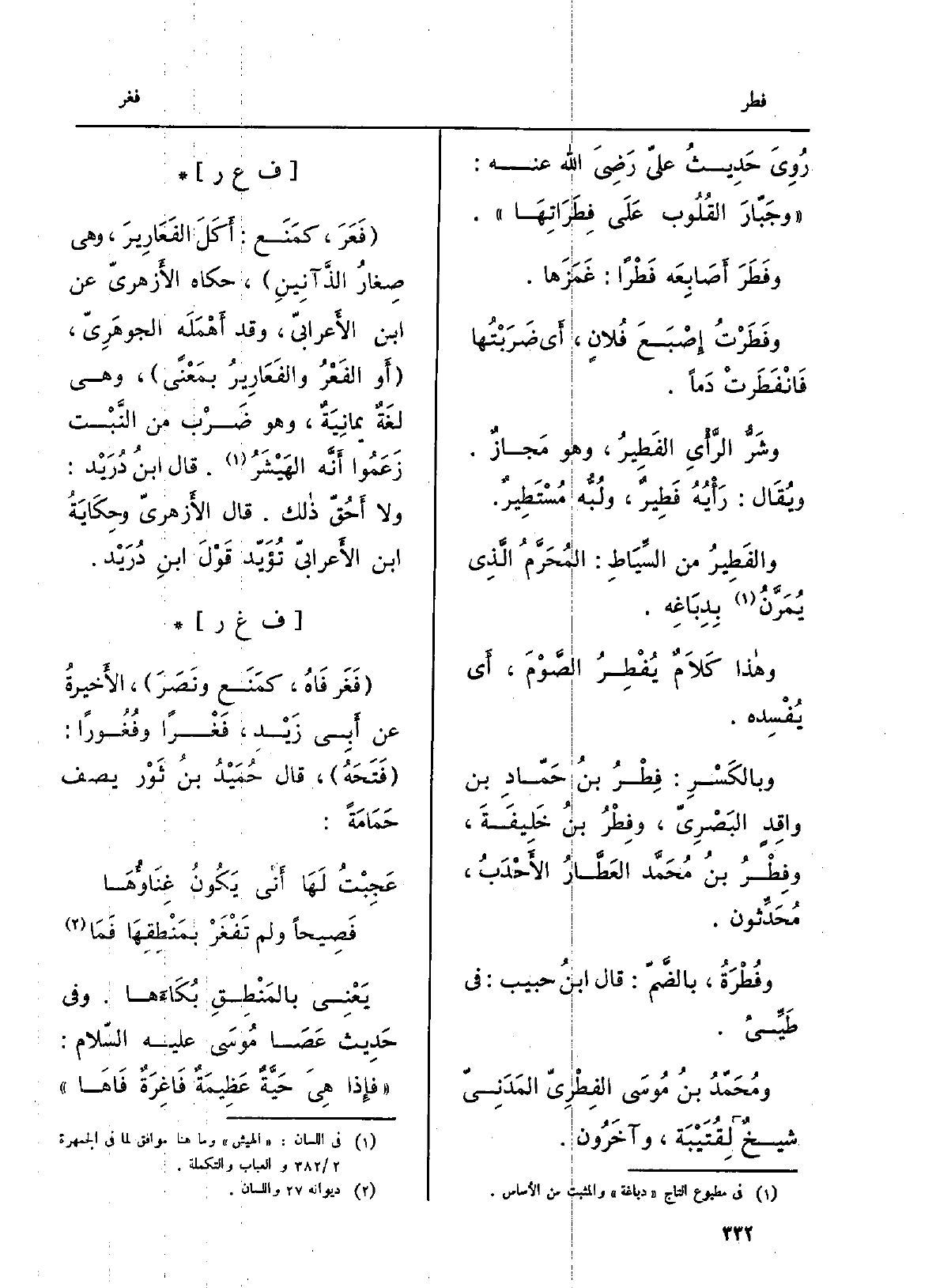 رُوِىَ حَدِيثُ عليّ رَضِيَ الله عَنهُ: وجَبّارَ القُلُوب عَلَى فِطَرَاتَهَا. وفَطَرَ أَصابِعَه فَطْراً: غَمَزَها. وفَطَرْتُ إِصْبَعَ فُلانٍ، أَي ضَرَبْتُها فانْفَطَرت دَماً. وشَرُّ الرَّأْيِ الفَطِيرُ، وَهُوَ مَجازٌ. ويُقَال: رَأْيُهُ فَطِيرٌ ولُبُّه مُسْتَطِيرٌ. والفَطِيرُ من السِّيَاطِ: المُحَرَّمُ الَّذِي يُمَرَّنُ بدِبَاغِه. وَهَذَا كَلاَمٌ يُفْطِرُ الصَّوْمَ، أَي يُفْسِده. وبالكَسْرِ: فِطْرُ بنُ حَمّادِ بن واقِدٍ البَصْرِيّ، وفِطْرُ بنُ خَلِيفَةَ، وفِطْرُ بنُ مُحَمَّد العَطَّارُ الأَحْدَبُ، مُحَدِّثون. وفُطْرَةُ، بالضَّمّ: قَالَ ابنُ حبيب: فِي طَيِّئ. ومُحَمّدُ بنُ مُوسَى الفِطْرِيّ المَدَنِيّ شيخٌ لِقُتَيْبَة، وآخَرُون.