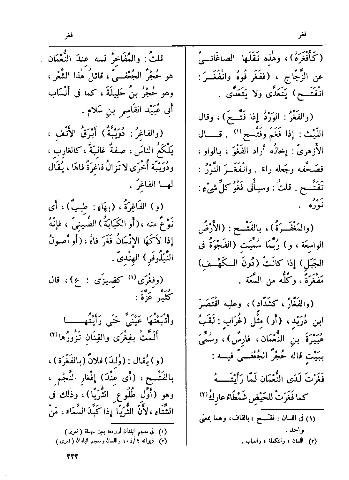 قلتُ: والمُفَاخِرُ لَهُ عِندَ النُّعْمَان هُوَ حُجْرٌ الجُعْفِيّ، قائلُ هَذَا الشِّعْر، وَهُوَ حُجْرُ بنُ حَلِيلَةَ، كَمَا فِي أَنْسَاب أَبي عُبَيْد القَاسِمِ بنِ سَلام. والفاغِرُ: دُوَيْبَّةٌ أَبْرَقُ الأَنْفِ، يَلْكَعُ الناسَ، صفةٌ غالِبَةٌ، كالغارِبِ، ودُوَيْبّة أُخْرَى لَا تَزالُ فاغَرِةً فاهَا، يُقَال لَهَا الفاغِرُ. والفَاغِرَةُ، بهَاءٍ: طِيبٌ، أَي نَوْعٌ مِنْهُ، أَو الكَبَابَةُ الصّينِيّ، فإِنّهُ إِذا لاَكَهَا الإِنْسَانُ فَغَرَ فاهُ، أَو أُصولُ النَّيْلُوفَرِ الهِنْدِيّ. وفِغَْرى كضِيزَى: ع، قَالَ كُثَيَّر عَزَّةَ: