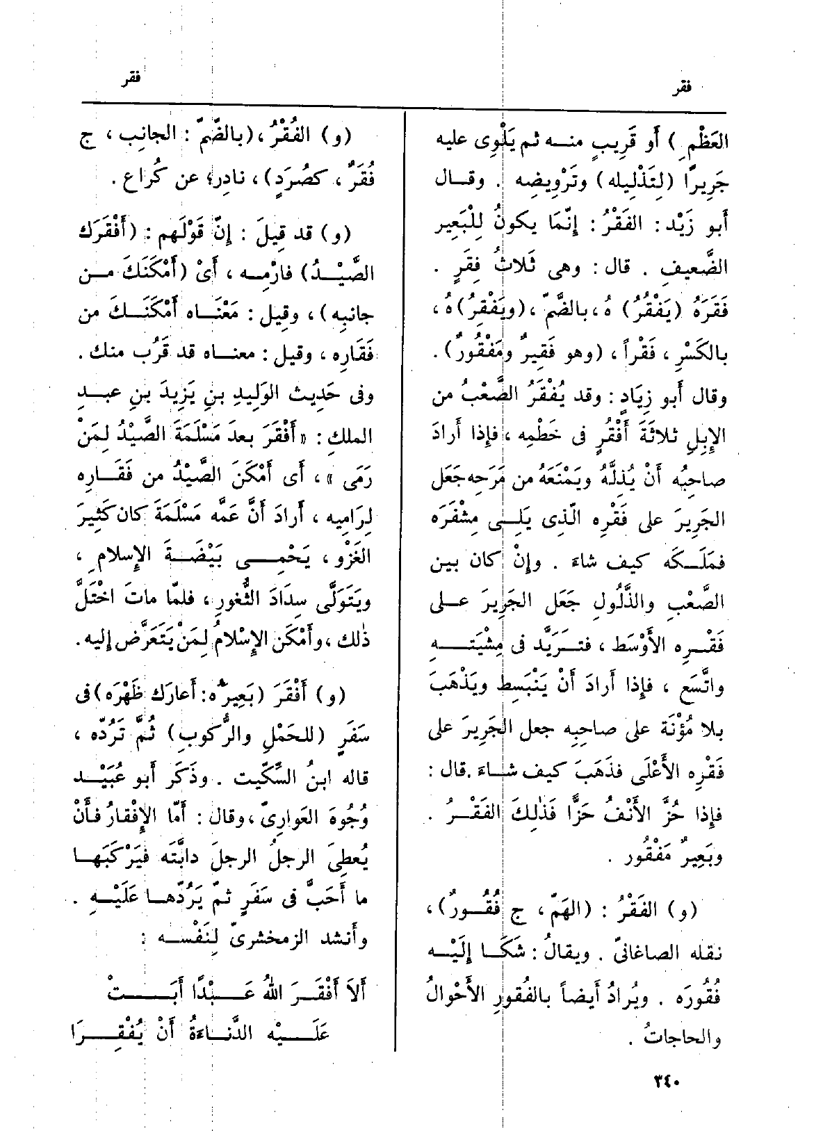 وبَعِيرٌ مَفْقُور. والفَقْرُ: الهَمّ، ج فُقُورٌ، نَقله الصاغانيّ. ويقالُ: شَكَا إِلَيْه فُقُورَه. ويُرادُ أَيضاً بالفُقورِ الأَحْوالُ والحاجاتُ. والفُقْرُ، بالضّمّ: الجانِب، ج فُقَرٌ، كصُرَدٍ، نادِر عَن كُراع. وَقد قِيلَ: إِنّ قَوْلَهم: أَفْقَرَك الصَّيْدُ فارْمِه، أَيْ أَمْكَنَكَ من جانبِه، وقِيل: مَعْنَاه أَمْكَنَكَ من فَقَارِه، وَقيل: مَعْنَاهُ قد قَرُب مِنْك. وَفِي حَدِيث الوَلِيدِ بنِ يَزِيدَ بنِ عبدِ الملكِ: أَفْقَرَ بعدَ مَسْلَمَةَ الصَّيْدُ لِمَنْ رَمَى، أَي أَمْكَنَ الصَّيْدُ من فَقَارِه لِرَامِيه، أَرادَ أَنَّ عَمَّه مَسْلَمَةَ كَانَ كَثِيرَ الغَزْو، يَحْمِي بَيْضَةَ الإِسلامِ، ويَتَوَلَّى سِدَادَ الثُّغورِ، فلمّا ماتَ اخْتَلَّ ذَلِك وأَمْكَن الإِسْلامُ لِمَنْ يَتَعَرَّض إِليه.