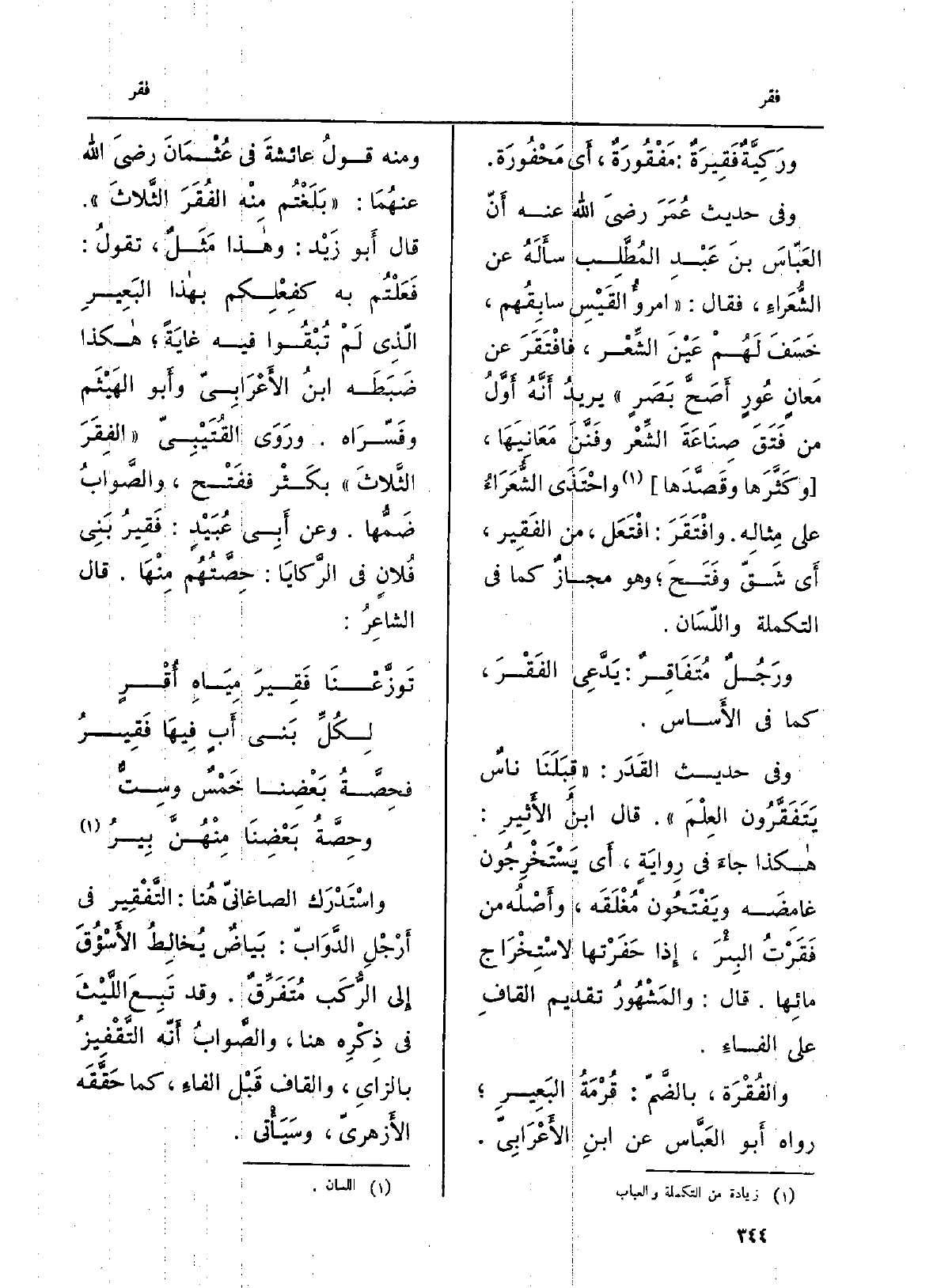 ورَكِيَّةٌ فَقِيرَةٌ: مَفْقُورَةٌ، أَي مَحْفُورَة. وَفِي حَدِيث عُمَرَ رضيَ الله عَنهُ أَنّ العَبّاسَ بنَ عَبْدِ المُطَّلِب سأَلَهُ عَن الشُّعَراءِ، فَقَالَ: امرؤُ القَيْسِ سابِقُهم، خَسَفَ لَهُمْ عَيْنَ الشَّعْر، فافْتَقَرَ عَن مَعانٍ عُورٍ أَصَحَّ بَصَرٍ يريدُ أَنَّهُ أَوَّلُ من فَتَقَ صِنَاعَةَ الشَّعْر وفَنَّنَ مَعَانِيَهَا، وكَثَّرَها وقَصَّدَها واحْتَذَى الشُّعَرَاءُ على مِثالِه. وافْتَقَرَ: افْتَعَل، من الفَقِير، أَي شَقّ وفَتَحَ وَهُوَ مجازٌ كَمَا فِي التكملة واللّسَان. ورَجُلٌ مُتَفَاقِرٌ: يَدَّعِى الفَقْرَ، كَمَا فِي الأَساس. وَفِي حَدِيث القَدَر: قَبَلَنَا ناسٌ يَتَفَقَّرُون العِلْمَ. قَالَ ابنُ الأَثِيرِ: هَكَذَا جاءَ فِي رِوَايَةٍ، أَي يَسْتَخْرِجُون غامِضَه ويَفْتَحُون مُغْلَقَه، وأَصْلُه من فَقَرْتُ البِئْرَ، إِذا حَفَرْتها لاسْتِخْرَاج مائِها. قَالَ: والمَشْهُورُ تَقْدِيم القافِ على الفاءِ. والفُقْرَة، بالضَّمّ: قُرْمَةُ البَعِيرِ رَوَاهُ أَبو العَبَّاس عَن ابنِ الأَعْرَابِيّ. وَمِنْه قولُ عائشةَ فِي عُثْمَانَ رَضِيَ)