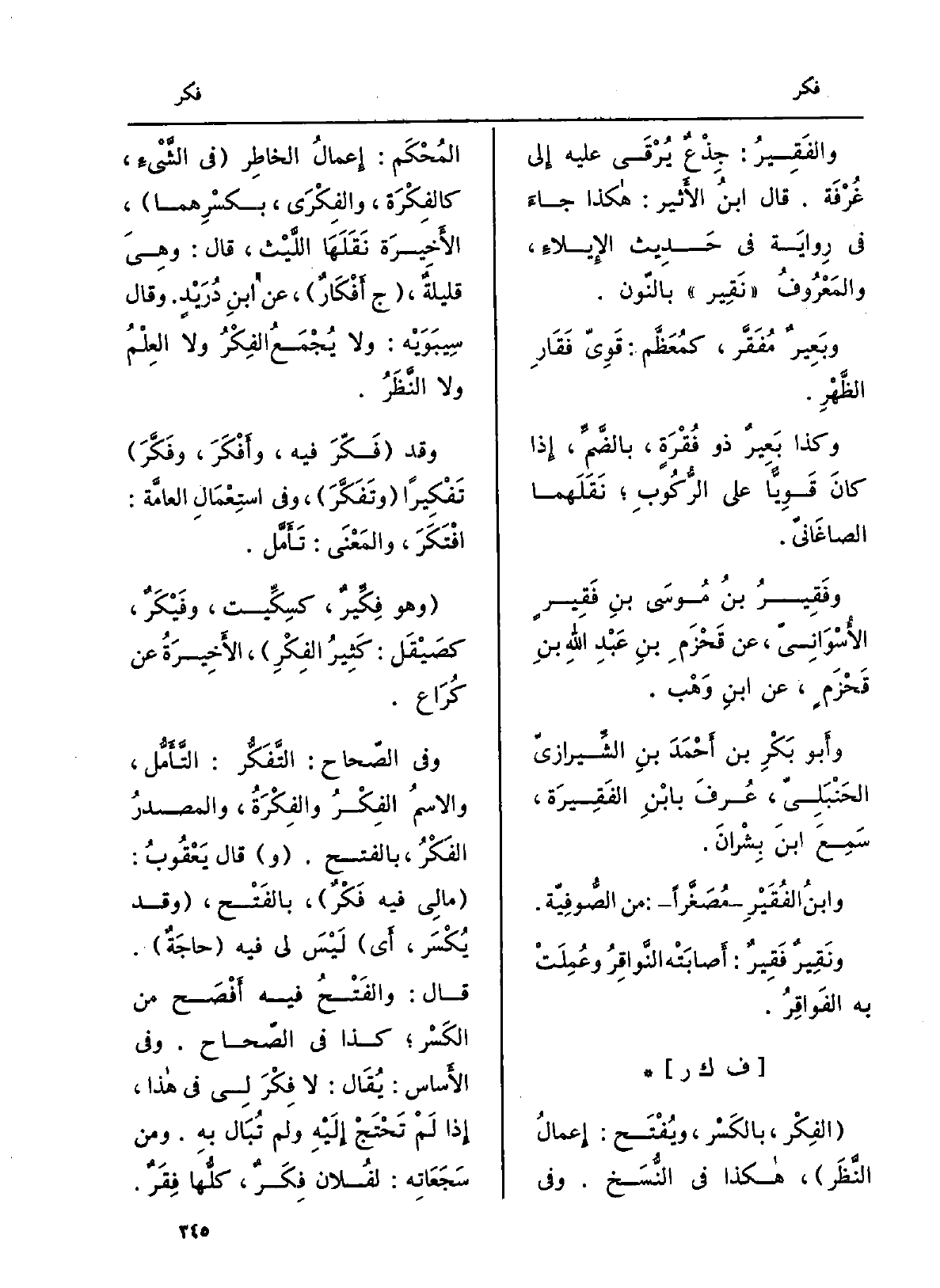 وَقَالَ سِيبَوَيْه: وَلَا يُجْمَعُ الفِكْرُ وَلَا العِلْمُ وَلَا النَّظَرُ. وَقد فَكّرَ فِيهِ، وأَفْكَرَ، وفَكَّرَ تَفْكِيراً وتَفَكَّرَ، وَفِي اسْتِعْمَالِ العامَّة: افْتَكَرَ، والمَعْنَى: تَأَمَّل. وَهُوَ فِكَّيرٌ، كسِكَّيت، وفَيْكَرٌ، كصَيْقَل: كَثِيرُ الفِكْرِ، الأَخِيرَةُ عَن كُرَاع. وَفِي الصّحاح: التَّفَكُّر: التَّأَمُّل، والاسمُ الفِكْرُ والفِكْرَةُ، والمصدرُ الفَكْرُ، بِالْفَتْح. وَقَالَ يَعْقُوبُ: مالِي فِيهِ فَكْرٌ، بالفَتْح، وَقد يُكْسَر، أَي لَيْسَ فِيهِ حاجَة. قَالَ: والفَتْحُ فِيهِ أَفْصَح من الكَسْر كَذَا فِي الصّحاح. وَفِي الأَساس: يُقَال: لَا فِكْرَ لِي فِي هَذَا، إِذا لم تَحْتَجْ إِلَيْهِ وَلم تُبَال بهِ. وَمن سَجَعَاتِه: لفُلان فِكَرٌ، كلُّها فِقَرٌ.