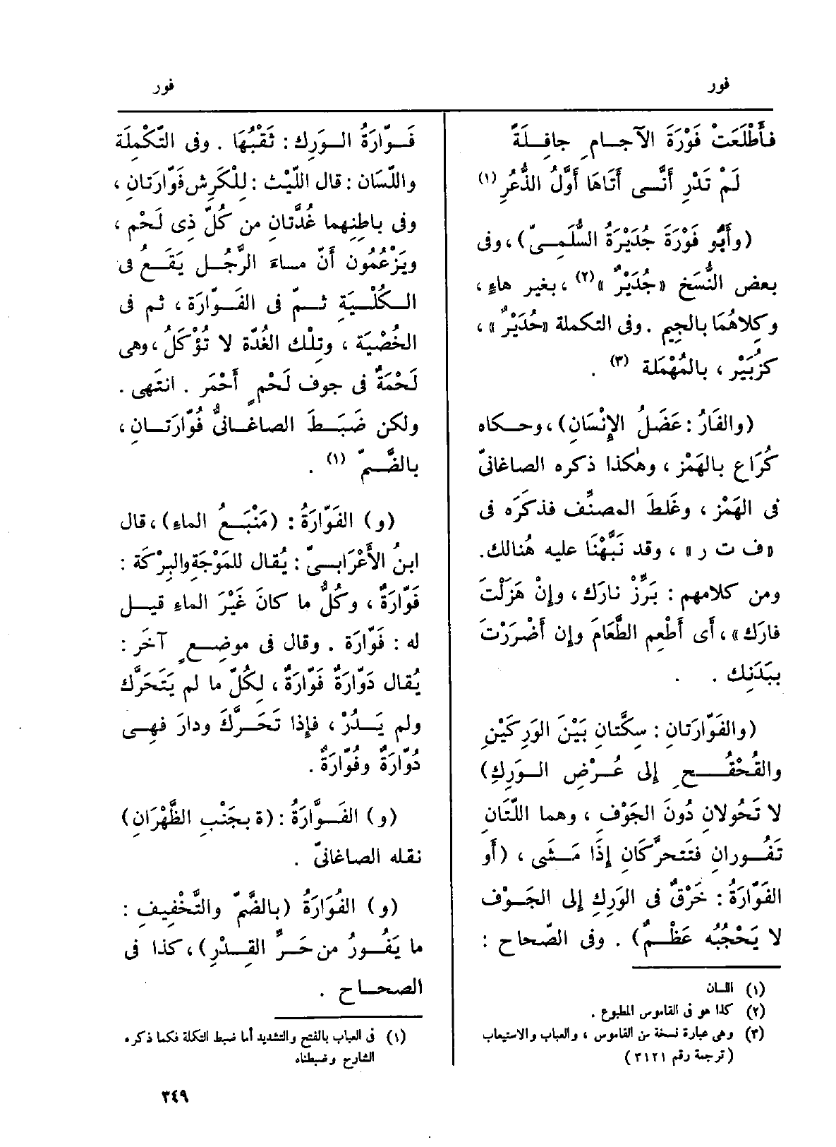 وأَبُو فَوْرَةَ جُدَيْرَةُ السُّلَمِىّ، وَفِي بعض النُّسَخ جُدَيْرٌ، بِغَيْر هاءٍ، وكِلاهُمَا بالجِيم. وَفِي التكملة حُدَيْرٌ، كزُبَيْر، بالمُهْمَلة.} والفَارُ: عَضَلُ الإِنْسَانِ، وَحَكَاهُ كُرَاع بالهَمْز، وَهَكَذَا ذكره الصاغانيّ فِي الهَمْز، وغَلطَ المصنِّف فذكَرَه فِي ف ت ر، وَقد نَبَّهْنا عَلَيْهِ هُنالك. وَمن كَلَامهم: بَرِّزْ نارَك، وإِنْ هَزَلْتَ {فارَك، أَي أَطْعِم الطَّعَامَ وإِن أَضْرَرْتَ ببَدنِك.} والفَوّارَتانِ: سِكَّتانِ بَيْنَ الوَرِكَيْنِ والقُحْقُحِ إِلى عُرْضِ الوَرِكِ لَا تَحُولانِ دُونَ الجَوْفِ، وهما اللَّتَانِ {تَفُورانِ فتَتحرَّكَانِ إِذَا مَشَى، أَو} الفَوّارَةُ: خَرْقٌ فِي الوَرِكِ إِلى الجَوْف لَا يَحْجُبُه عَظْمٌ. وَفِي الصّحاح: {فَوّارَةُ الوَرِك: ثَقْبُهَا. وَفِي التّكْمِلَة واللّسَان: قَالَ اللّيْث: لِلْكَرِش} فَوّارَتانِ، وَفِي باطِنِهما غُدَّتانِ من كُلّ ذِي لَحْم، ويَزْعُمُون أَنّ ماءَ الرَّجُل يَقَعُ فِي الكُلْيَةِ ثمّ فِي الفَوّارَة، ثمَّ الخُصْيَة، وتِلْك الغُدّة لَا تُؤْكَلُ، وَهِي لَحْمَةٌ فِي جوفِ لَحْمٍ أَحْمَر. انتَهى. وَلَكِن ضَبَطَ الصاغانيُّ فُوّارَتانِ، بالضَّمّ. والفَوّارَةُ: مَنْبَعُ الماءِ، قَالَ ابنُ الأَعْرَابِيّ: يُقال للمَوْجَةِ والبِرْكَة: فَوّارَةٌ، وكُلُّ مَا كانَ غَيْرَ الماءِ قيل لَهُ: فَوّارَة.