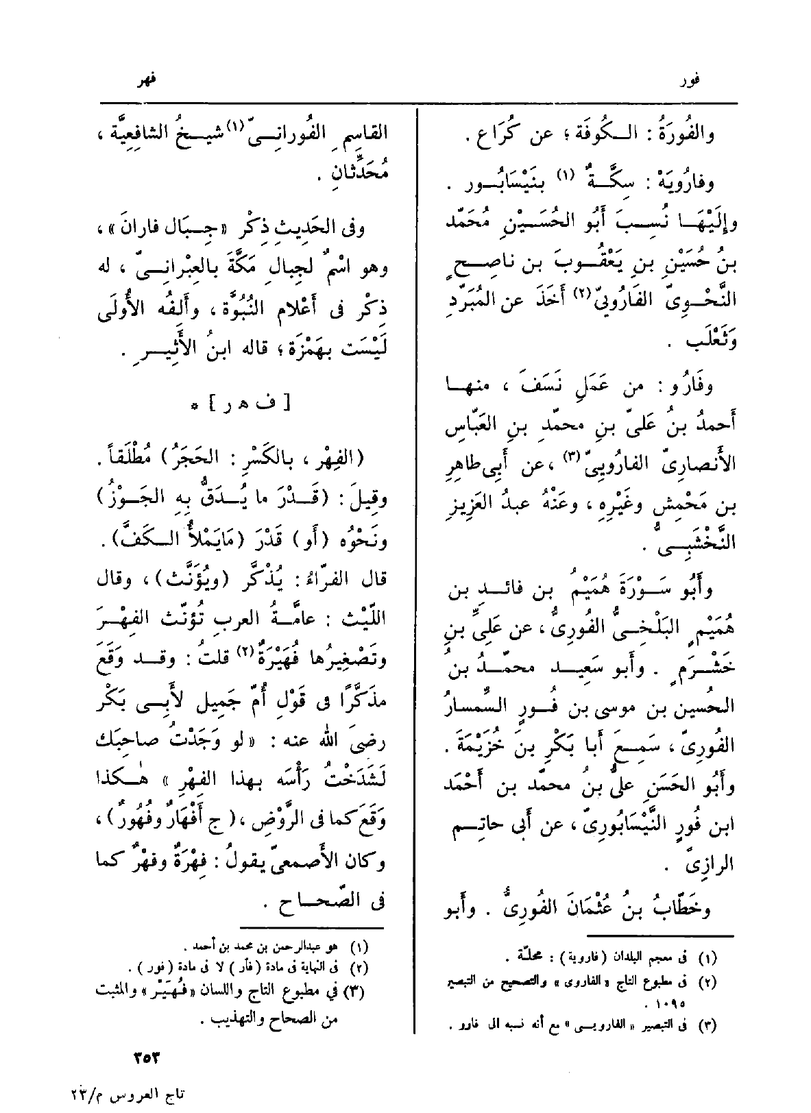 {والفُوْرَةُ: الكُوفَة عَن كُرَاع.} وفارُويَهْ: سِكَّةٌ بنَيْسَابُور. وإِلَيْهَا نُسِبَ أَبُو الحُسَيْنِِ مُحَمّد بنُ حُسَيْنِ بنِ يَعْقُوبَ بن ناصِحٍ النَّحْوِيّ {- الفَارُوييّ أَخَذَ عَن المُبَرّدِ وثَعْلَب.} وفَارُو: من عَمَلٍ نَسَفَ، مِنْهَا أَحمدُ بنُ عَليّ بنِ محمّدِ بنِ العَبّاسِ الأَنصارِيّ الفارُويِيّ، عَن أَبِي طاهِرِ بن مَحْمِش وغَيْرِهِ، وعَنْهُ عبدُ العَزِيزِ النَّخْشَبِيُّ. وأَبُو سَوْرَةَ هُمَيْمُ بن فائِدِ بن هُمَيْمٍ البَلْخِيُّ {- الفُورِيُّ، عَن عَلِيِّ بنِ خَشْرَمٍ. وأَبو سَعِيد محمّدُ بنُ الحُسين بن مُوسَى بن فُورٍ السِّمسارُ الفُورِيّ، سَمِعَ أَبا بَكْرِ بنَ خُزَيْمَةَ. وأَبُو الحَسَنِ عليُّ بنُ محمّد بن أَحْمَد ابْن فُورٍ النَّيْسَابُورِيّ، عَن أَبي حاتِم الرازِيّ. وخَطّابُ بنُ عُثْمَانَ الفُورِيُّ. وأَبو القاسِمِ} - الفُورانِيّ شيخُ الشافِعِيَّة، مُحَدِّثانِ. وَفِي الحَدِيث ذِكْر جِبَال! فارانَ، وَهُوَ اسْمٌ لِجبالِ مَكَّةَ بالعِبْرانِيّ، لَهُ ذِكْر فِي أَعْلام النُبُوَّة، وأَلِفُه الأُولَى لَيْسَت بهَمْزَة قَالَه ابنُ الأَثِيرِ