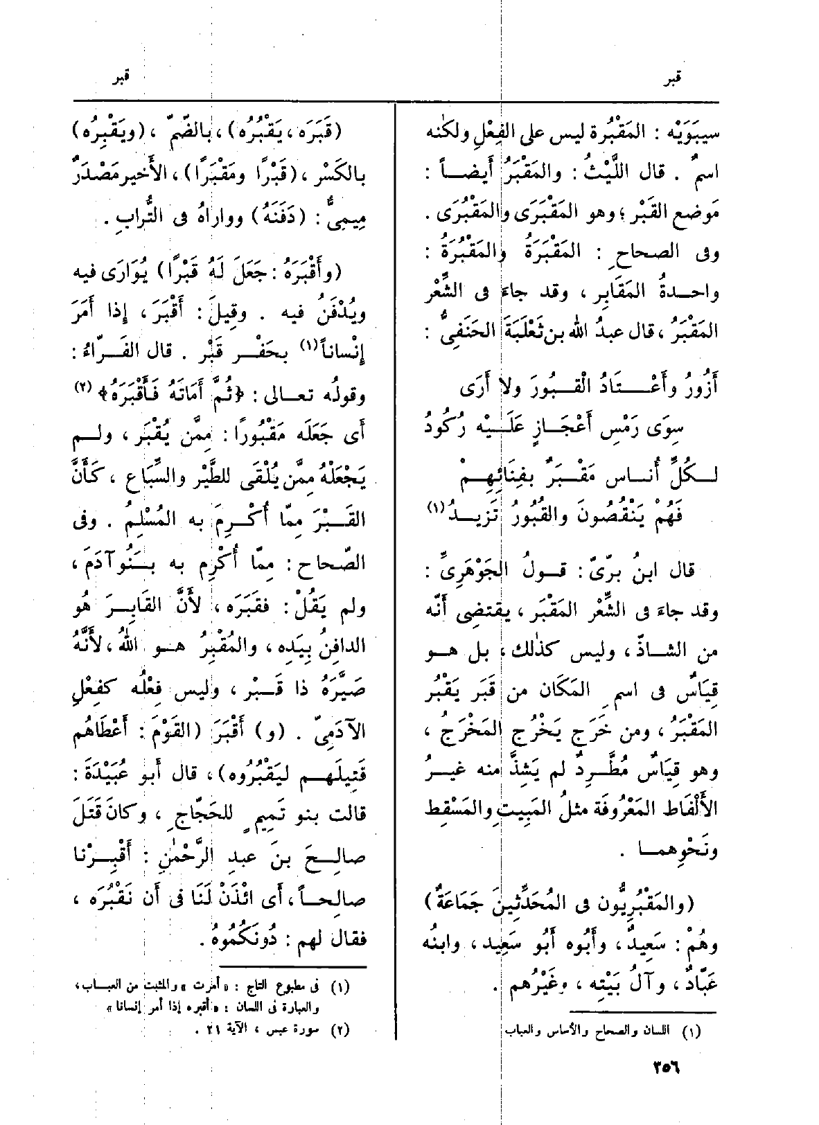 سيبَوَيْه: المَقْبُرة لَيْسَ على الفِعْلِ وَلكنه اسمٌ. قَالَ اللَّيْثُ: والمَقْبَرُ أَيضاً: مَوضع القَبْر وَهُوَ المَقْبَرَى والمَقْبُرَى. وَفِي الصحاحِ: المَقْبَرَةُ والمَقْبُرَةُ: واحدةُ المَقَابِر، وَقد جاءَ فِي الشِّعْر المَقْبَرُ، قَالَ عبدُ الله بن ثَعْلَبَةَ الحَنَفِيُّ: