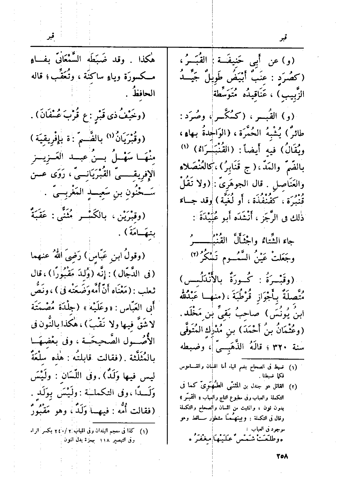 وقُبْرَيَانُ بالضَّمّ: ة بإِفْرِيقِيَة مِنْهَا سَهْلُ بنُ عبد العَزِيزِ الإِفْرِيقِي القُبْرَيَانِيّ، رَوَى عَن سَحْنُونِ بنِ سَعِيدٍ المَغْرِبيّ. وقِبْرَيْن، بالكَسْر مُثَنّىً: عَقَبَةٌ بتِهَامَةَ. وقولُ ابنِ عَبّاسٍ رَضِيَ اللهُ عَنْهُمَا فِي الدَّجّال: إِنَّه وُلِدَ مَقْبُوراً، قَالَ ثَعْلَب: مَعْنَاه أَنّ أُمَّه وَضَعَتْه فِي، ونَصَّ أَبي العَبّاس: وعَلَيْه جِلْدَة مُصْمَتَة لَا شَقَّ فِيها وَلَا نَقْبَ، هَكَذَا بالنُّون فِي الأُصُول الصَّحيحَة، وَفِي بَعْضِها بالمُثَلَّثة. فَقَالَت)