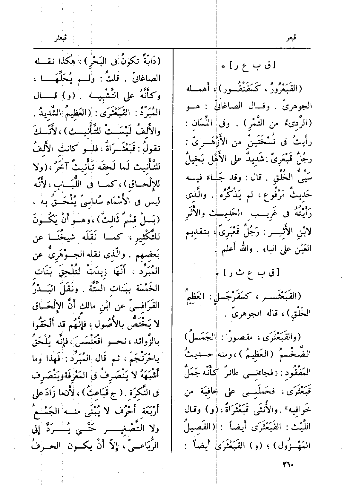 . القَبَعْثَر، كسَفَرْجَلٍ: العَظِيمُ الخَلْقِ، قَالَه الجوهريّ. والقَبَعْثَرَي، مَقْصُورا: الجَمَلُ الضَّخْمُ العَظِيمُ، وَمِنْه حديثُ المَفْقُودِ: فجاءَنِي طائرٌ كأَنّه جَمَلٌ قَبَعْثَرَي، فحَملَنِي على خافِيَة من خَوافِيه. والأُنْثَى قَبَعْثَرَاةٌ، وَقَالَ اللَّيْث: القَبَعْثَرَى أَيضاً: الفَصِيلُ المَهْزُول والقَبَعْثَرَى أَيضاً: دَابّةٌ تكونُ فِي البَحْرِ، هَكَذَا نَقله الصاغانيّ. قلتُ: وَلم يُحَلِّهَا، وكأَنَّهُ على التَّشْبِيه. وَقَالَ المُبَرّدُ: القَبَعْثَرَى: العَظِيمُ الشَّدِيدُ. والأَلِفُ لَيْسَتْ للتَّأْنِيث، لأَنّكَ تقولُ: قَبَعْثَرَاةٌ، فَلَو كانتِ الأَلِفُ للتَّأْنِيث لَما لَحِقَه تَأْنِيثٌ آخَرُ، وَلَا للإِلْحاقِ، كَمَا فِي اللُّبَابِ، لأَنّه لَيْسَ فِي الأَسْمَاءِ سُداسِيّ يُلْحَقُ بِهِ، بَلْ قِسْمٌ ثَالِثٌ، وَهُوَ أَنْ يَكُونَ للتَّكْثِيرِ، كَمَا نَقَلَه شيخُنَا عَن بَعْضِهِم. والّذِي نَقله الجَوْهَرِيُّ عَن المُبَرِّد، أَنَّهَا زِيدَتْ لتُلْحِقَ بَنَاتِ الخَمْسَة ببَناتِ السِّتَّة. ونَقَلَ البَدْرُ القَرَافِيّ عَن ابْنِ مالكٍ أَنَّ الإِلْحَاق لَا يَخْتَصُّ بالأُصُول، فإِنَّهُم قد أَلْحَقُوا بالزَّوائد، نَحْو اقْعَنْسَسَ، فإِنَّه يُلْحَقُ باحْرَنْجَمَ، ثمَّ قَال المُبَرِّد: فَهذا وَمَا أَشْبَهَهُ لَا يَنْصَرِفُ فِي المَعْرفَة ويَنْصَرِف فِي النَّكِرَةِ. ج قَبَاعِثُ، لأَن مَا زَادَ على أَرْبَعَةِ أَحْرُف لَا يُبْنَى مِنْهُ الجَمْعُ وَلَا التَّصْغِير حَتَّى يُرَدَّ إِلَى الرُّبَاعيّ، إِلاّ أَنْ يكون الْحَرْف