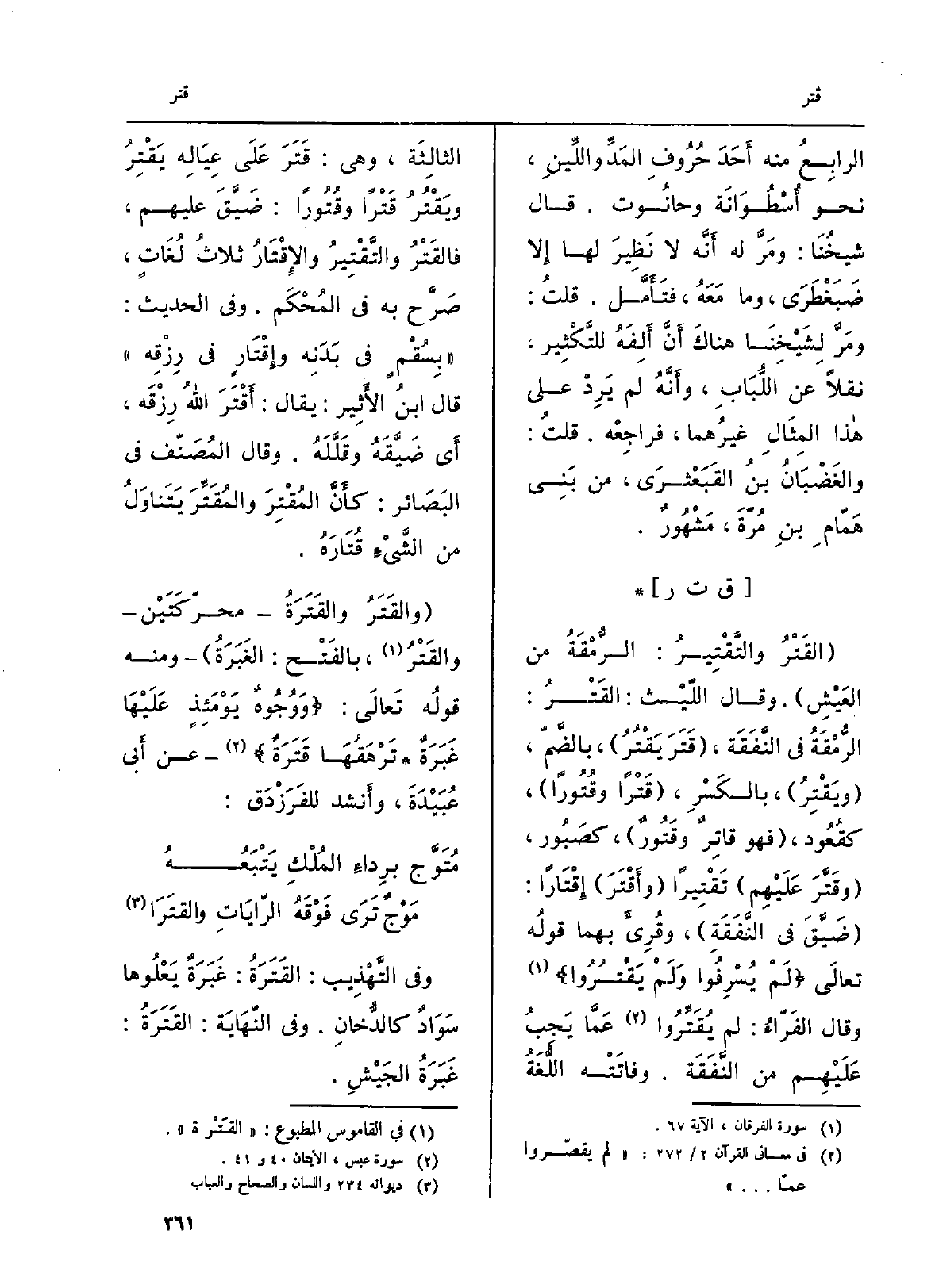 . القَتْرُ والتَّقْتِيرُ: الرُّمْقَةُ من العَيْشِ. وَقَالَ اللّيْث: القَتْرُ: الرُّمْقَةُ فِي النَّفَقَة، قَتَرَ يَقْتُرُ، بالضَّمّ، ويَقْتِرُ، بالكَسْرِ، قَتْراً وقُتُوراً، كقُعُود، فَهُوَ قاتِرٌ وقَتُورٌ، كصَبُور، وقَتَّرَ عَلَيْهِم تَقْتِيراً وأَقْتَرَ إِقْتَاراً: ضَيَّقَ فِي النَّفَقَةِ، وقُرِئَ بهما قولُه تعالَى: لَمْ يُسْرِفُوا وَلَمْ يَقْتُرُوا وَقَالَ الفَرّاءُ: لم يُقَتِّرُوا عَمَّا يَجِبُ عَلَيْهِم من النَّفَقَة. وفاتَتْه اللُّغَةُ الثالِثَة، وَهِي: قَتَرَ عَلَى عِيَالِه يَقْتِرُ ويَقْتُرُ قَتْراً وقُتُوراً: ضَيَّقَ عَلَيْهِم، فالقَتْر والتَّقْتِيرُ والإِقْتَارُ ثلاثُ لُغَاتٍ، صَرَّح بِهِ فِي المُحْكَم. وَفِي الحَدِيث: بِسُقْمٍ فِي بَدَنِه وإِقْتَارِ فِي رِزْقِه قَالَ ابنُ الأَثِيرِ: يُقَال: أَقْتَرَ اللهُ رِزْقَه، أَي ضَيَّقَهُ وقَلَّلَهُ. وَقَالَ المُصَنّف فِي البَصَائر: كأَنَّ المُقْتِرَ والمقُتَر يَتَناولُ من الشَّيْءِ قُتَارَهُ. والقَتَرُ والقَتَرَةُ محرّكَتَيْن والقَتْرُ، بالفَتْح: الغَبَرَةُ وَمِنْه قولُه تَعالَى: وَوُجُوهٌ يَوْمَئِذٍ عَلَيْهَا غَبَرَةٌ تَرْهَقُهَا قَتَرَةٌ عَن أَبي عُبَيْدَةَ، وأَنشد للفَرَزْدَق: