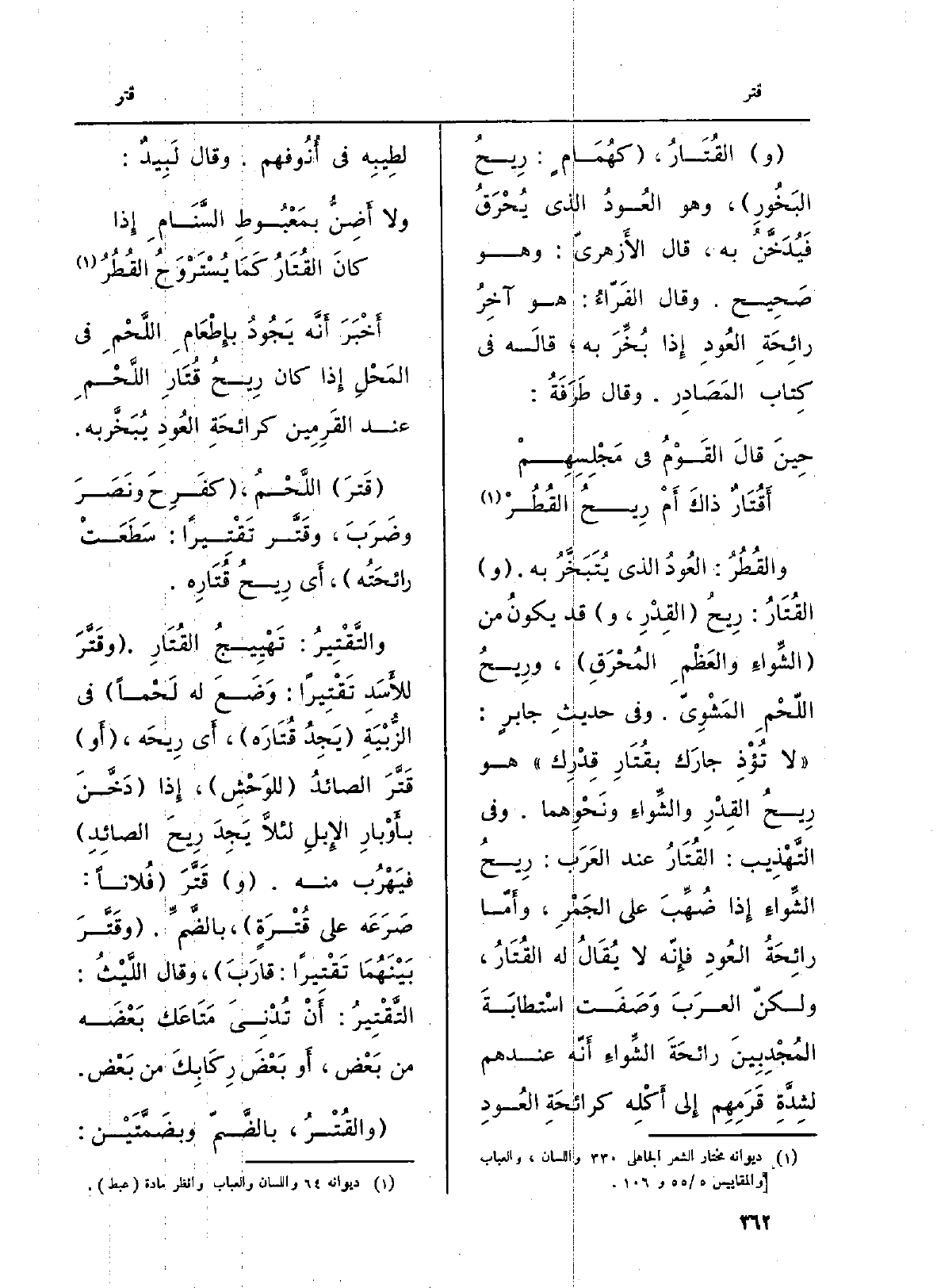 والقُطُرُ: العُودُ الَّذِي يُتَبَخَّرُ بِهِ. والقُتَارُ: رِيحُ القِدْرِ، وَقد يكونُ من الشِّواءِ والعَظْمِ المُحْرَقِ، وريِحُ اللّحْمِ المَشْوِيّ. وَفِي حديثِ جابرٍ: لَا تُؤْذِ جارَك بقُتَارِ قِدْرِكَ هُوَ رِيحُ القِدْرِ والشِّواءِ ونَحْوِهما. وَفِي التَّهْذِيب: القُتَارُ عِنْد العَرَب: رِيحُ الشِّواءِ إِذا ضُهِّبَ على الجَمْرِ، وأَمّا رائِحَةُ العُودِ فإِنّه لَا يُقَالُ لَهُ القُتَارُ، ولكنّ العرَبَ وَصَفَت اسْتطابَةَ المُجْدِبِينَ رائحَةَ الشِّواءِ أَنّه عِنْدهم لِشِدَّةِ قَرَمِهِم إِلى أَكْلِه كرائحَةِ العُودِ لِطِيبِة فِي أُنُوفهم وَقَالَ لَبِيدٌ: