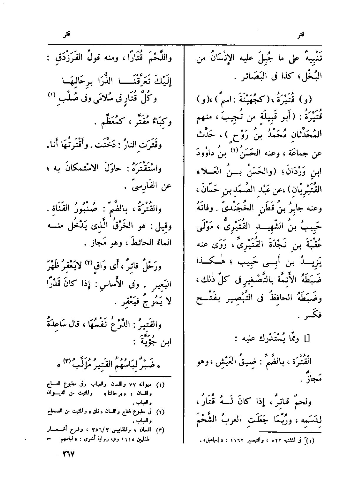 تَنْبِيهٌ على مَا جُبِلَ عَلَيْهِ الإِنْسَانُ من البُخْل، كَذَا فِي البَصَائر. وقُتَيْرَةُ، كجُهَيْنةَ: اسمٌ، وقُتَيْرَةُ: أَبو قَبِيلَةٍ من تجُيِب، َ مِنْهُم المُحَدِّثانِ مُحَمّدُ بنُ رَوْحٍ، حَدَّث عَن جماعَة، وَعنهُ الحَسنُ بنُ داوُودَ ابنِ وَرْدَانَ والحَسَنُ بنُ العَلاءِ القُتَيْرِيّانِ، عَن عَبْدِ الصَّمَدِ بنِ حَسّانَ، وَعنهُ جابِرُ بنُ قَطَنٍ الخُجَنْدىّ. وفاتَهُ حَبِيبُ بنُ الشّهِيد القُتَيْرِيُّ، مَوْلَى عُقْبَةَ بنِ نَجْدَةَ القُتَيْرِيِّ، رَوَى عَنهُ يَزِيدُ بن أَبِي حَبِيب هَكَذَا ضَبَطَهُ الأَئِمَّة بالتَّصْغِيرِ فِي كلّ ذَلِك، وضَبَطَهُ الحافِظُ فِي التَّبْصِير بفَتْح فكَسر. وممّا يُسْتَدْرك عَلَيْهِ: القُتْرَة، بالضَّمِّ: ضِيقُ العَيْشِ، وَهُوَ مَجازٌ. ولحمٌ قاتِرٌ، إِذا كانَ لَهُ قُتَارٌ، لِدَسَمِه، ورُبّمَا جَعَلَتِ العربُ الشَّحْمَ واللَّحْمَ قُتَاراً، وَمِنْه قولُ الفَرَزْدَقِ: