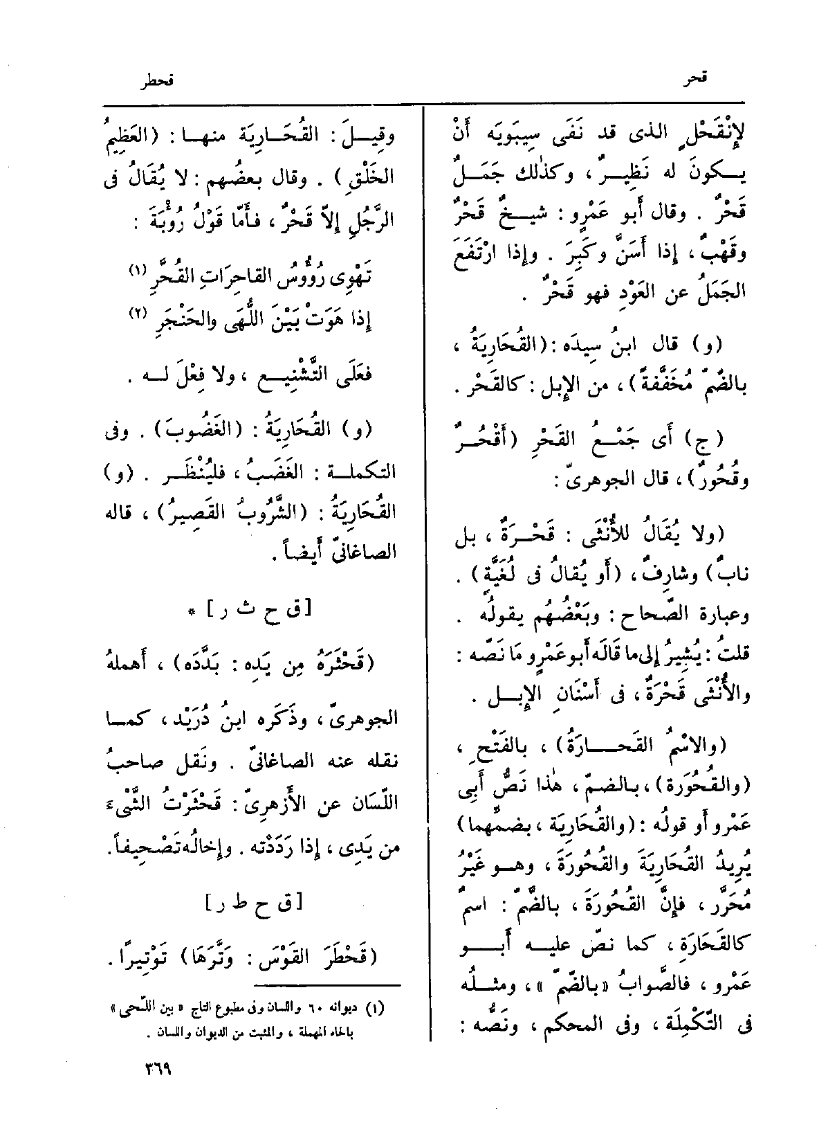 ٍ لإِنْقَحْلٍ الَّذِي قد نَفَى سِيبَويَه أَنْ يكونَ لَهُ نَظِيرٌ، وَكَذَلِكَ جَمَلٌ قَحْرٌ. وَقَالَ أَبو عَمْروٍ: شيخٌ قَحْرٌ وقَهْبٌ، إِذا أَسَنَّ وكَبِرَ. وإِذا ارْتَفَعَ الجَمَلُ عَن العَوْدِ فَهُوَ قَحْرٌ. وَقَالَ ابنُ سِيدَه: القُحَارِيَةُ، بالضّمّ مُخَفَّفةً، من الإِبل: كالقَحْر. ج أَي جَمْعُ القَحْرِ أَقْحُرٌ وقُحُورٌ، قَالَ الجوهريّ: وَلَا يُقالُ للأُنْثَى: قَحْرَةٌ، بل نابٌ وشارِفٌ، أَو يُقالُ فِي لُغَيَّةٍ. وَعبارَة الصّحاح: وبَعْضُهُم يقولُه. قلتُ: يُشِيرُ إِلى مَا قَالَه أَبوعَمْرٍ وَمَا نَصّه: والأُنْثَى قَحْرَةٌ، فِي أَسْنَانِ الإِبِل. والاسْمُ القَحارَةُ، بالفَتْحِ، والقُحُورَة، بالضمّ، هَذَا نَصُّ أَبِي عَمْرو أَو قولُه: والقُحَارِيَة، بضمِّهما يُريدُ القُحَارِيَةَ والقُحُورَةَ، وَهُوَ غَيْرُ مُحَرَّر، فإِنَّ القُحُورَةَ، بالضَّمّ: اسمٌ كالقَحَارَةِ، كَمَا نصّ عَلَيْهِ أَبو عَمْرو، فالصَّوابُ بالضّمّ، ومثلُه فِي التّكْمِلَة، وَفِي الْمُحكم، ونَصُّه: وقِيلَ: القُحَارِيَة مِنْهَا: العَظِيمُ الخَلْقِ. وَقَالَ بعضُهم: لَا يُقَالُ فِي الرَّجُلِ إِلاّ قَحْرٌ، فأَمّا قَوْلُ رُؤْبَةَ: