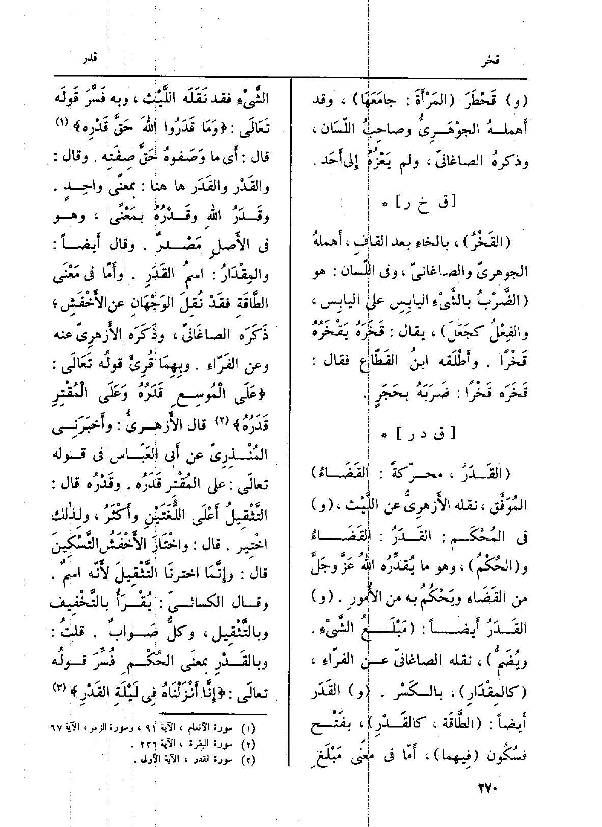 ويُضَمُّ، نَقله الصاغانيّ عَن الفرّاءِ، كالمِقْدَارِ، بالكَسْر. والقَدَر أَيضاً: الطَّاقَة، كالقَدْرِ، بفَتْح فسُكُون فِيهما، أَمّا فِي معنَى مَبْلَغِ الشَّيْءِ فقد نَقَلَه اللَّيْث، وَبِه فَسَّرَ قَولَه تَعالَى: ومَا قَدَرُوا اللهَ حَقَّ قَدْرِه. قَالَ: أَي مَا وَصَفوهُ حَقَّ صِفَتِه. وَقَالَ: والقَدْر والقَدَر هَا هُنَا: بِمَعْنى، وَهُوَ فِي الأَصْلِ مَصْدرٌ. وَقَالَ أَيضاً: والمِقْدَارُ: اسمُ القَدَرِ. وأَمّا فِي مَعْنَى الطَّاقَةِ فقَدْ نُقِلَ الوَجْهَانِ عَن الأَخْفَشِ ذَكرَه الصاغَانيّ، وذَكَرَه الأَزْهرِيّ عَنهُ وَعَن الفَرّاءِ. وبِهمَا قُرِئَ قولُه تَعَالَى: عَلَى المُوَسِعِ قَدَرُهُ وَعَلَى المُقْتِرِ قَدْرُهُ. قَالَ الأَزهريُّ: وأَخْبَرَنِي المُنْذِرِيّ عَن أَبي العَبّاس فِي قَوْله تعالَى: على المُقْتِر قَدَرُه. وقَدْرُه قَالَ: التَّثْقِيلُ أَعْلَى اللُّغَتَيْنِ وأَكْثَرُ، ولِذلك اخْتِير. قَالَ: واخْتَار الأَخْفَشُ التَّسْكِينَ قَالَ: وإِنَّمَا اخترنَا التَّثْقِيلَ لأَنّه اسمٌ. وَقَالَ الكسائيّ: يُقْرَأُ بالتَّخْفِيف وبالتَّثْقِيل، وكلٌّ صَوابٌ. قلتُ: وبالقدْرِ بمعنَى الحُكْمِ فُسِّرَ قولُه تعالَى: إِنَّا أَنْزَلْنَاهُ فِي لَيْلَةِ القَدْرِ.
