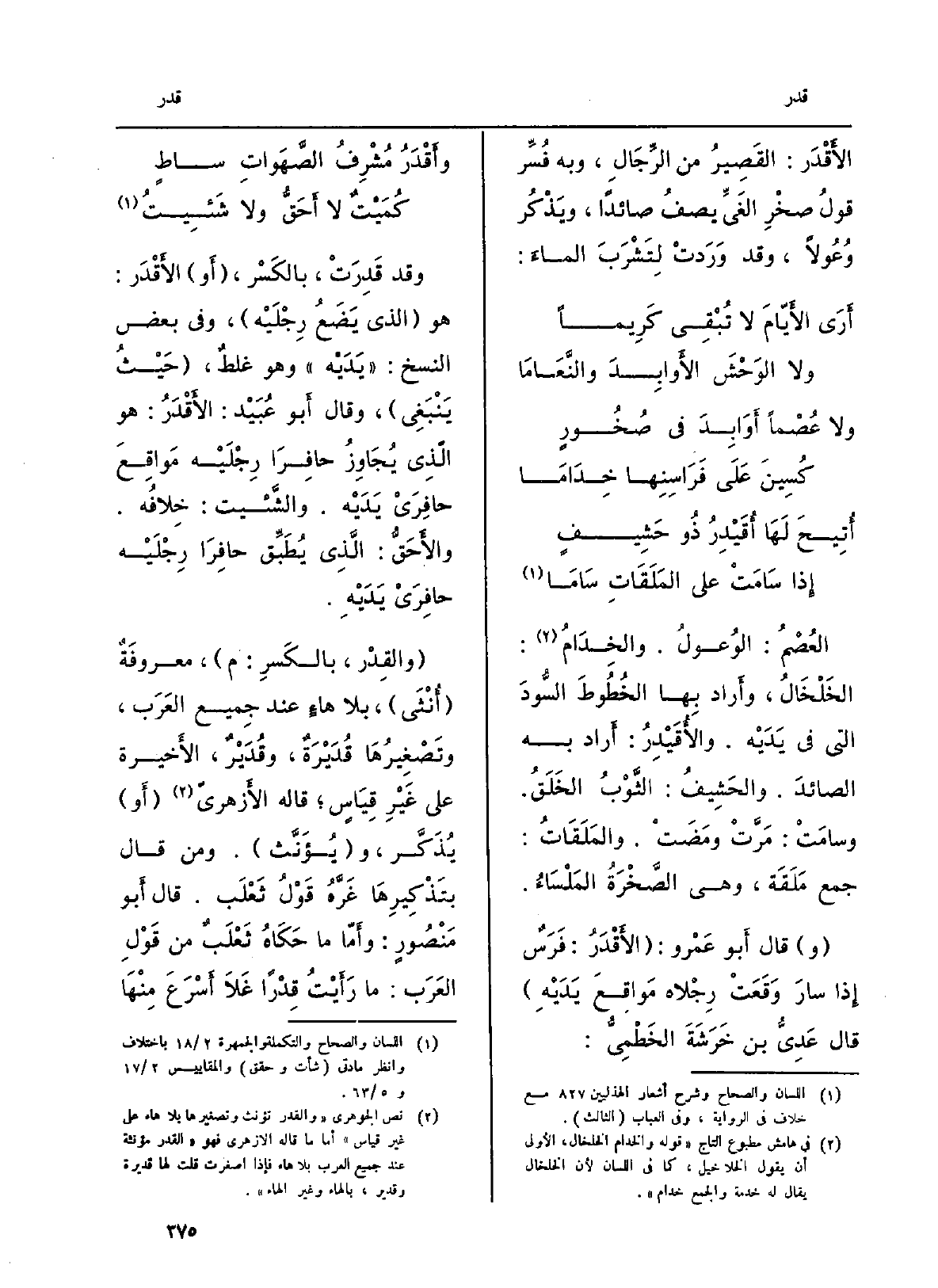 الأَقْدَر: القَصِيرُ من الرِّجَالِ، وَبِه فُسِّر قولُ صخْرِ الغَيِّ يصفُ صائداً، ويَذْكُر وُعُولاً، وَقد وَرَدتْ لِتَشْرَبَ الماءَ: