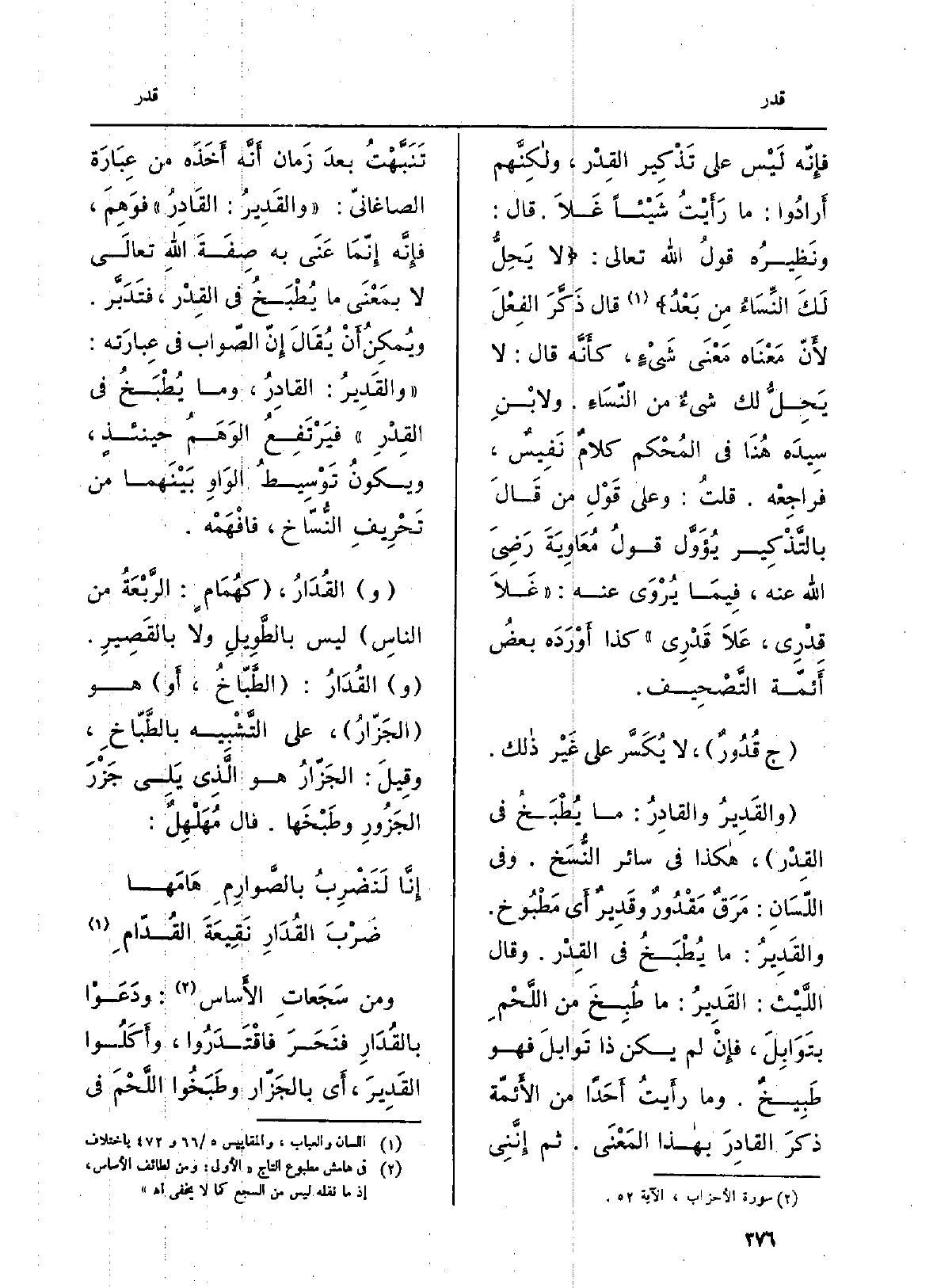 الفِعْلَ لأَنّ مَعْنَاه مَعْنَى شَيْءٍ، كأَنَّه قَالَ: لَا يَحِلُّ لَك شيْءٌ من النِّسَاءِ. ولابْنِ سِيدَه هُنَا فِي المُحْكم كلامٌ نَفِيسٌ، فراجِعْه. قلتُ: وعَلى قَوْلِ من قَالَ بالتَّذْكِير يُؤَوَّل قولُ مُعَاوِيَةَ رَضِيَ الله عَنهُ، فِيْمَا يُرْوَى عَنهُ: غَلاَ قِدْرِي، عَلاَ قَدْرِي كَذَا أَوْرَدَه بعضُ أَئمّة التَّصْحِيف. ج قُدُورٌ، لَا يُكَسَّر على غَيْر ذَلِك. والقَدِيرُ والقادِرُ: مَا يُطْبَخُ فِي القِدْر، هَكَذَا فِي سَائِر النُّسَخ. وَفِي اللّسَانِ: مَرَقٌ مَقْدُورٌ وقَدِيرٌ أَي مَطْبُوخ. والقَدِيرُ: مَا يُطْبَخُ فِي القِدْر. وَقَالَ اللَّيْث: القَدِيرُ: مَا طُبِخَ من اللَّحْمِ بتَوَابِلَ، فإِنْ لم يكن ذَا تَوابلَ فَهُوَ طَبِيخٌ. وَمَا رأَيتُ أَحَداً من الأَئمّة ذكرَ القادِرَ بِهَذَا المَعْنَى. ثمَّ إِنَّنِي تَنَبَّهْتُ بعدَ زَمان أَنَّه أَخَذَه من عِبَارَة الصاغانيّ: والقَدِيرُ: القَادِرُ فَوهِمَ، فإِنَّه إِنّمَا عَنَى بِهِ صِفَةَ اللهِ تعالَى لَا بمَعْنَى مَا يُطْبَخُ فِي القِدْر، فتَدَبَّر. ويُمْكِنُ أَنْ يُقَالَ إِنّ الصّواب فِي عِبَارَته: والقَدِيرُ: القادِرُ، وَمَا يُطْبَخُ فِي القِدْرِ فيرْتَفِع الوَهَمُ حينئذٍ، ويكونُ تَوْسِيطُ الوَاوِ بَيْنَهُما من تَحْرِيفِ النُّسّاخ، فافْهَمْه. والقُدَارُ، كهُمَامٍ: الرَّبْعَةُ من الناسِ لَيْسَ بالطَّوِيلِ وَلَا بالقَصِيرِ. والقُدَارُ: الطَّبّاخُ، أَو هُوَ الجِزّارُ، على التَّشْبِيه بالطَّبّاخِ، وقِيلَ: الجَزّارُ هُوَ الَّذِي يَلِي جَزْرَ الجَزُورِ وطَبْخَها. قَالَ مُهَلْهِلٌ: