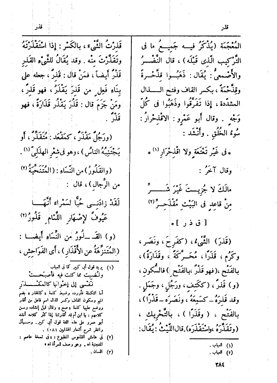 . قَذرَ الشَّيْءُ، كفَرِحَ، ونَصَر، وكَرُم، قَذَراً، مُحَرَّكَةً، وقَذَارَةً، بالفَتْح، فَهُوَ قَذْرٌ، بالفَتْحِ فالسُّكونِ، وقَذْرٌ، ككَتِفٍ، ورَجُلٍ، وجَمَلٍ. وَقد قَذِرَهُ كسَمِعَهُ، ونَصَرَه قَذْراً، بالفَتْح، وقَذَراً، بالتَّحْرِيكِ، وتَقَذَّرَهُ، واسْتَقْذَرَه. قَالَ اللّيْثُ: يُقَال: قَذِرْتُ الشَّيْءَ، بالكَسْر: إِذا اسْتَقْذَرْتَهُ وتَقَذَّرْتَ مِنْه. وَقد يُقَالُ للشَّيْءِ القَذِرِ قَذْرٌ أَيضاً، فمَنْ قَالَ: قَذِرٌ، جعله على بِنَاءٍ فَعِلٍ من قَذِرَ يَقْذَرُ، فَهُوَ قَذِرٌ، ومَنْ جَزَمَ قَالَ: قَذُرَ يَقْذُر قَذَارَةً، فَهُوَ قَذْرٌ. ورَجُلٌ مَقْذَرٌ، كمَقْعَد: مُتَقَذِّرٌ، أَو يَجْتَنِبُهُ الناسُ، وَهُوَ فِي شِعْرِ الهذَلِيّ. والقَذُورُ من النّسَاءِ: المُتَنَحِّيَةُ من الرِّجالِ، قَالَ:
