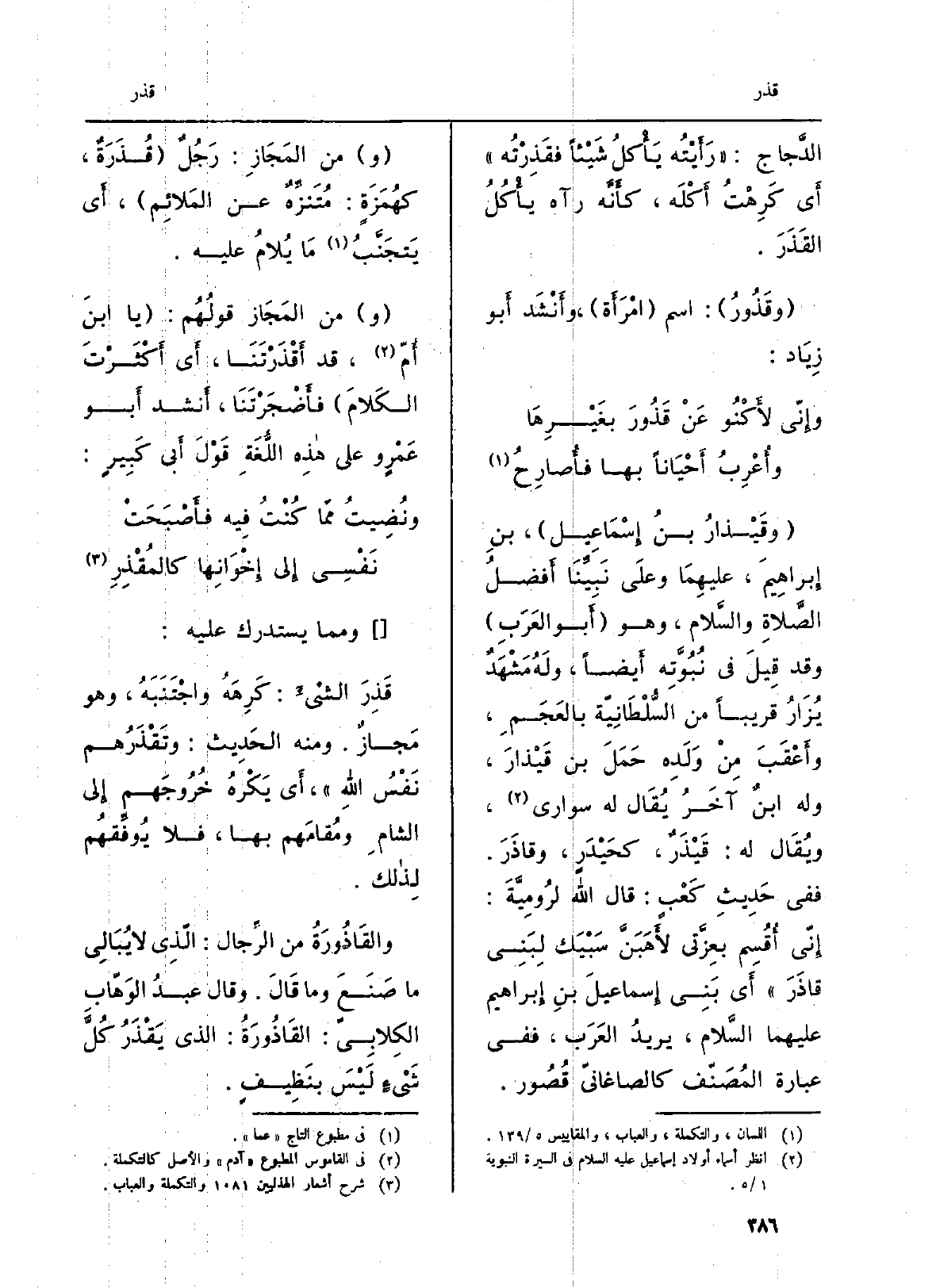 وقَيْذارُ بنُ إِسْمَاعِيل، بنِ إِبراهيمَ، عليهِمَا وعلَى نَبِيِّنَا أَفْضلُ الصَّلاةِ والسَّلام، وَهُوَ أَبو العَرَبِ وَقد قِيلَ فِي نُبُوَّتِه أَيضاً، ولَهُ مَشْهَدٌ يُزَارُ قَرِيبا من السُّلْطَانِيّة بالعَجَمِ، وأَعْقَبَ مِنْ وَلَدِه حَمَلَ بن قَيْذارَ، وَله ابنٌ آخَرُ يُقَال لَهُ سوارى، ويُقَال لَهُ: قَيْذَرٌ، كحَيْدَرٍ، وقاذَرَ. فَفِي حَدِيثِ كَعْبٍ: قَالَ الله لرُومِيَّةَ: إِنّي أُقُسِم بِعزَّتي لأَهَبَنَّ سَبْيَك لِبَنِي قاذَرَ أَي بَنِي إِسماعيلَ بنِ إِبراهيم عَلَيْهِمَا السَّلام، يريدُ العَرَب، فَفِي عبارَة المُصَنّف كالصاغانيّ قُصُور. وَمن المَجَازِ: رَجُلٌ قُذَرَةٌ، كهُمَزَةٍ: مُتَنزِّهٌ عَن المَلائِم، أَي يَتجَنَّبُ مَا يُلامُ عَلَيْهِ. وَمن المَجازِ قولُهُم: يَا ابنَ أُمّ، قد أَقْذَرْتَنَا، أَي أَكْثَرْتَ الكَلامَ فأَضْجَرْتَنَا، أَنشد أَبو عَمْروٍ على هذِه اللُّغَةِ قَوْلَ أَبي كَبِيرٍ: