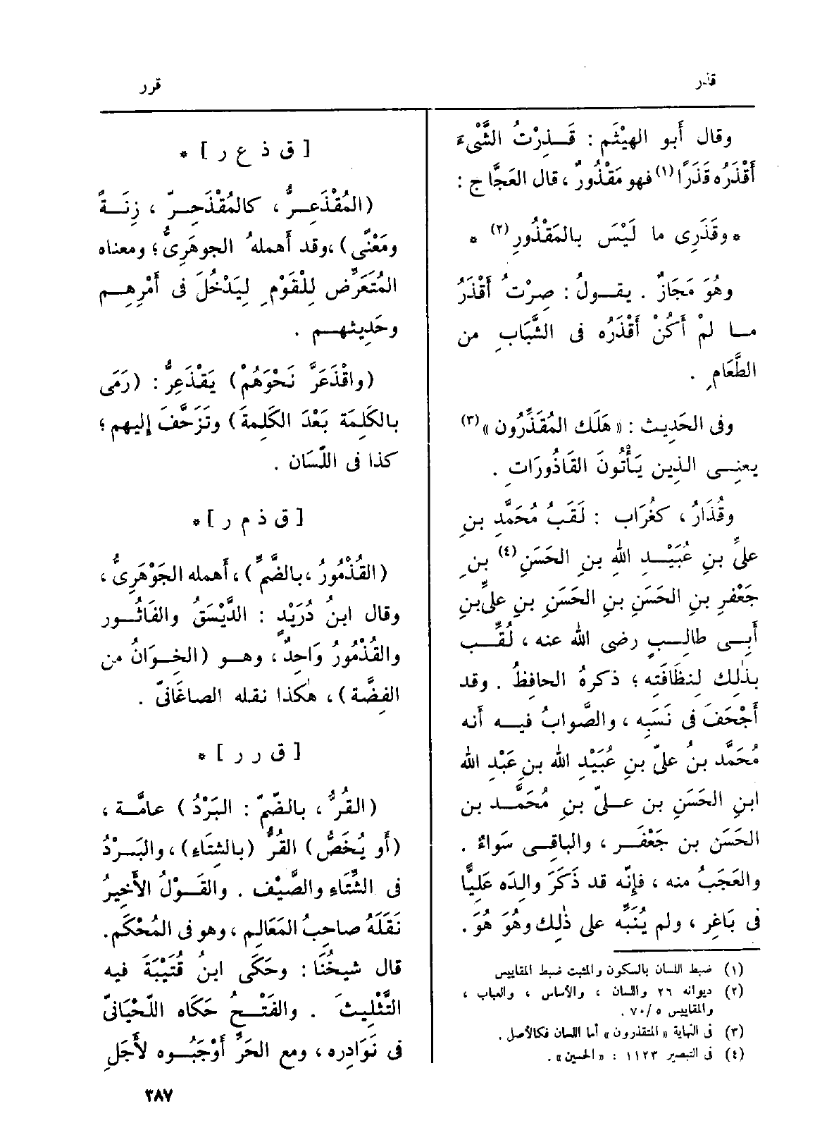 وَقَالَ أَبو الهَيْثَم: قَذِرْتُ الشَّيْءَ أَقْذَرُه قَذَراً فَهُوَ مَقْذُورٌ، قَالَ العَجَّاج: وقَذَرِي مَا لَيْسَ بالمَقْذُورِ. وهُو مَجَازٌ. يقولُ: صِرْتُ أَقْذَرُ مَا لمْ أَكُنْ أَقْذَرُه فِي الشَّبَابِ من الطَّعَامِ. وَفِي الحَدِيث: هَلَك المُقَذِّرُون يعنِي الذِين يأَتُونَ القَاذُورَاتِ. وقُذَارُ، كغُرَاب: لَقَبُ مُحَمَّدِ بنِ عليِّ بنِ عُبَيْدِ اللهِ بنِ الحَسَنِ بنِ جَعْفَرِ بنِ الحَسَنِ بنِ الحَسَنِ بنِ عليِّ بنِ أَبِي طالِبٍ رَضِي الله عَنهُ، لُقِّب بذلِك لِنَظَافَتِه ذكرهُ الحافِظُ. وَقد أَجْحَفَ فِي نَسَبِه، والصَّوابُ فِيهِ أَنه مُحَمَّد بنُ عليّ بنِ عُبَيْد الله بنِ عَبْدِ الله ابنِ الحَسَنِ بن عليّ بنِ مُحَمَّد بن الحَسَن بن جَعْفَر، والباقِي سَواءٌ. والعَجَبُ مِنْهُ، فإِنّه قد ذَكَرَ والِدَه عَلِيّاً فِي بَاغِر، وَلم يُنَبِّه على ذلِك وهُوَ هُوَ.