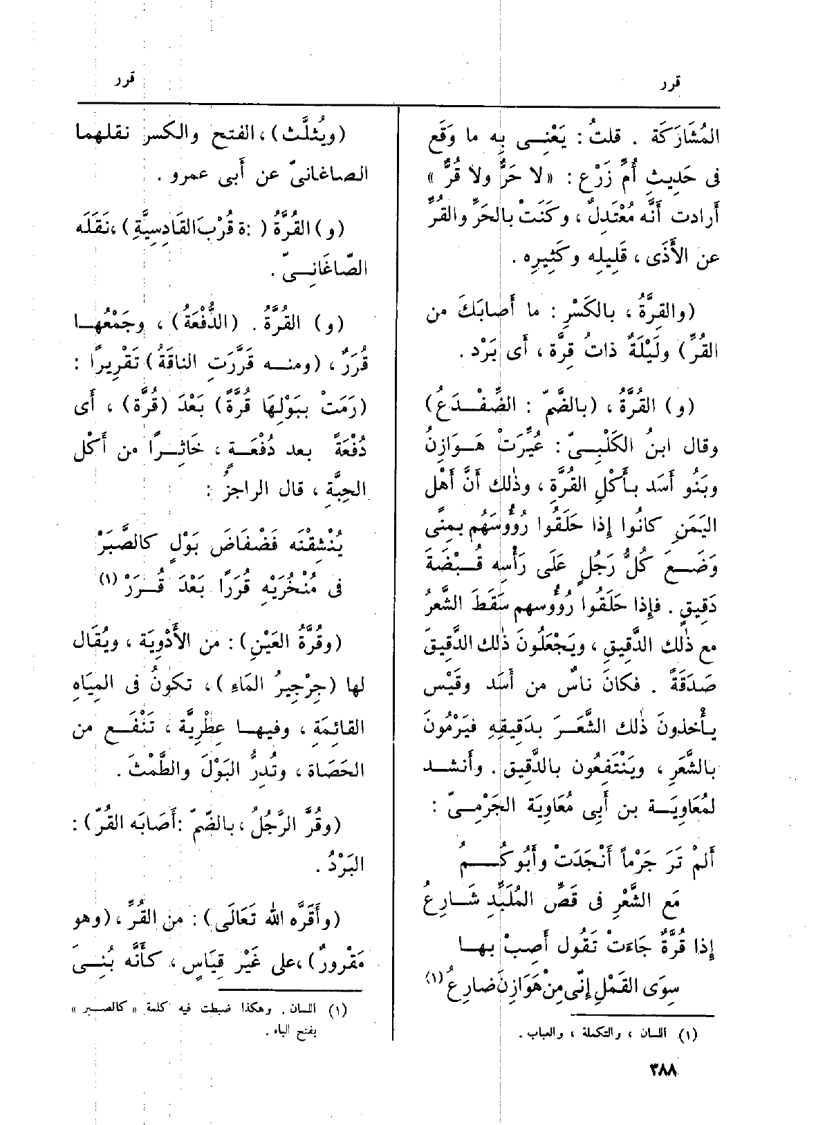 المُشَارَكَة. قلتُ: يَعْنِي بِهِ مَا وَقَع فِي حَدِيثِ أُمِّ زَرْع: لَا حَرٌّ وَلَا {قُرٌّ أَرادت أَنَّه مُعْتَدِلٌ، وكَنَتْ بالحَرِّ والقُرِّ عَن الأَذَى، قَلِيلِه وكَثِيرِه.} والقِرَّةُ، بالكَسْرِ: مَا أَصابَك من {القُرِّ ولَيْلَةٌ ذاتُ} قِرَّة، أَي بَرْد. {والقُرَّةُ، بالضَّمّ: الضِّفْدَعُ وَقَالَ ابنُ الكَلْبِيّ: عُيِّرَتْ هَوَازِنُ وبَنُو أَسَد بأَكْلِ القُرَّةِ، وَذَلِكَ أَنَّ أَهْل اليَمَنِ كانُوا إِذا حَلَقُوا رُؤُوسَهُم بمِنىً وَضَعَ كُلُّ رَجُلٍ عَلَى رَأْسِه قُبْضَةَ دَقِيقٍ. فإِذا حَلَقُوا رُؤُوسهم سَقَطَ الشَّعْرُ مَعَ ذَلِك الدَّقِيقِ، ويَجْعَلُونَ ذَلِك الدَّقِيقَ صَدَقةً. فَكَانَ ناسٌ من أَسَد وقَيْس يأْخذونَ ذَلِك الشَّعَرَ بدَقِيقِهِ فيَرْمُونَ بالشَّعَرِ، ويَنْتَفِعُون بالدَّقِيق. وأَنشد لمُعَاوِيَة بن أَبِي مُعَاوِيَة الجَرْمِيّ: