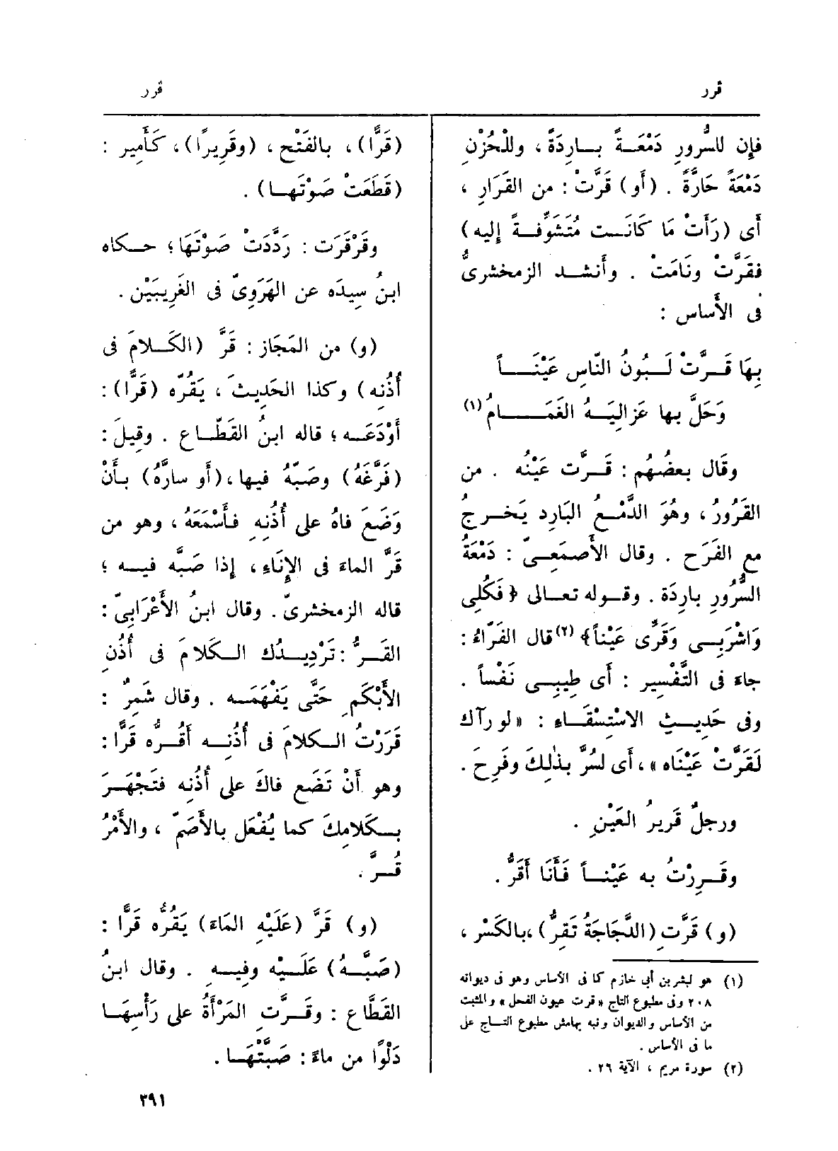 فإِن للسُّروِر دَمْعَةً بارِدَةً، وللحُزْنِ دَمْعَةً حَاَّرةً. أَو قَرَّتْ: من القَرَارِ، أَي رَأَتْ مَا كَانَتْ مُتَشَوِّفةً إِليه فقَرَّتْ ونَامَتْ. وأَنشد الزمخشريُّ فِي الأَساس: