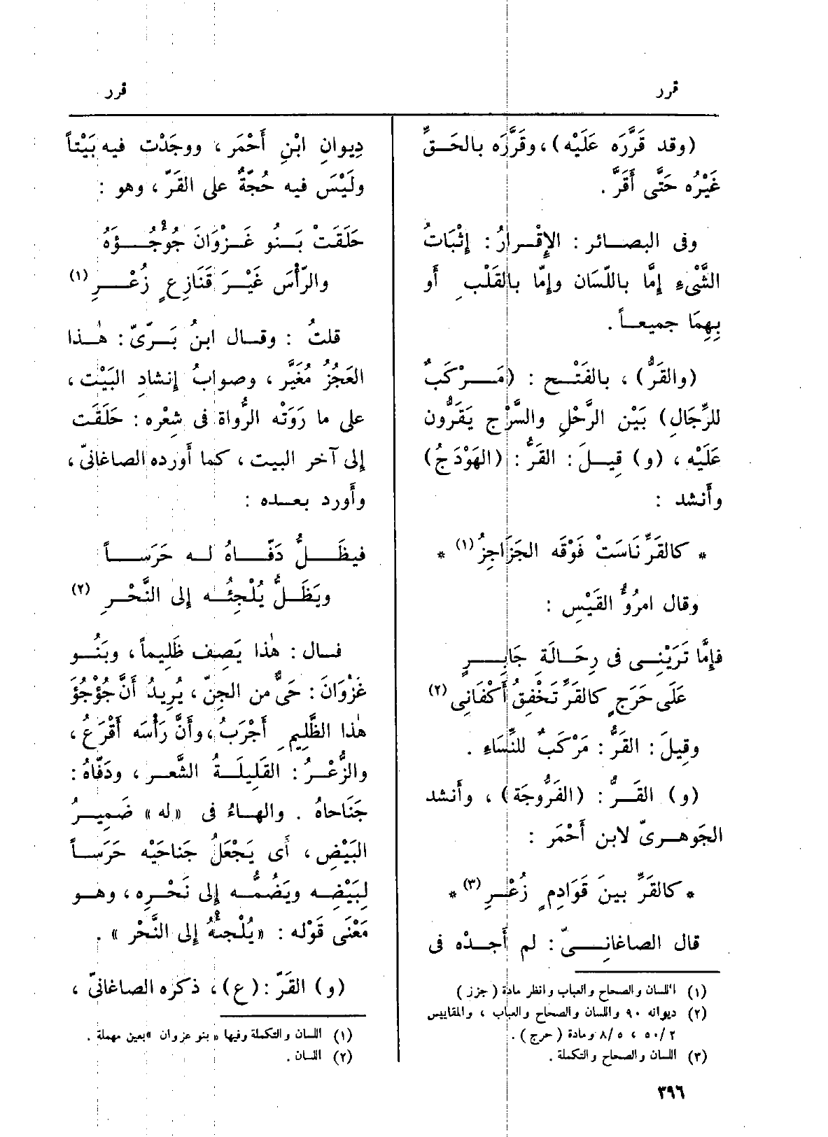 وقِيلَ:! القَرُّ: مَرْكَبٌ للنِّسَاءِ. والقَرُّ: الفَرُّوجَة، وأَنشد الجَوهريّ لِابْنِ أَحْمَر: كالقَرِّ بينَ قَوَادِمٍ زُعْرِ. قَالَ الصاغانِيّ: لم أَجدْه فِي دِيوانِ ابْنِ أَحْمَر، ووجَدْت فِيهِ بَيْتاً ولَيْسَ فِيهِ حُجّةٌ على القَرّ، وَهُوَ: